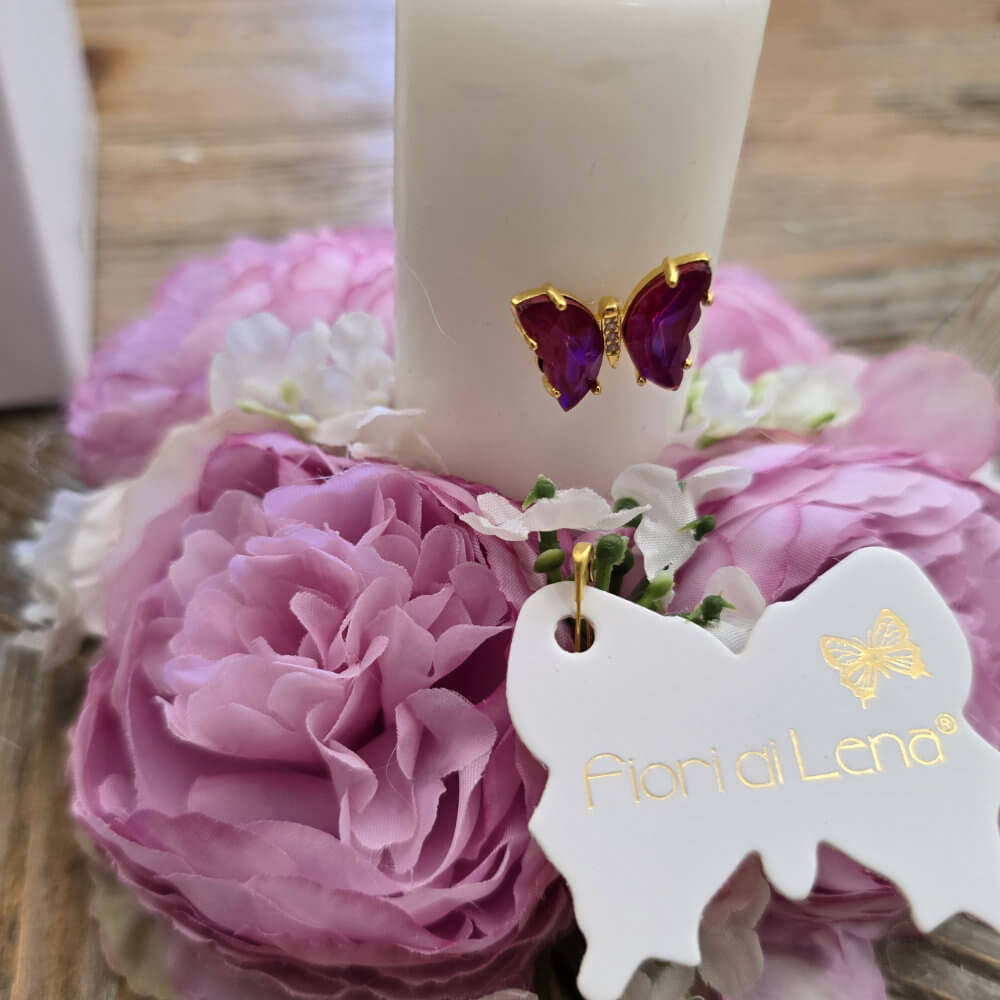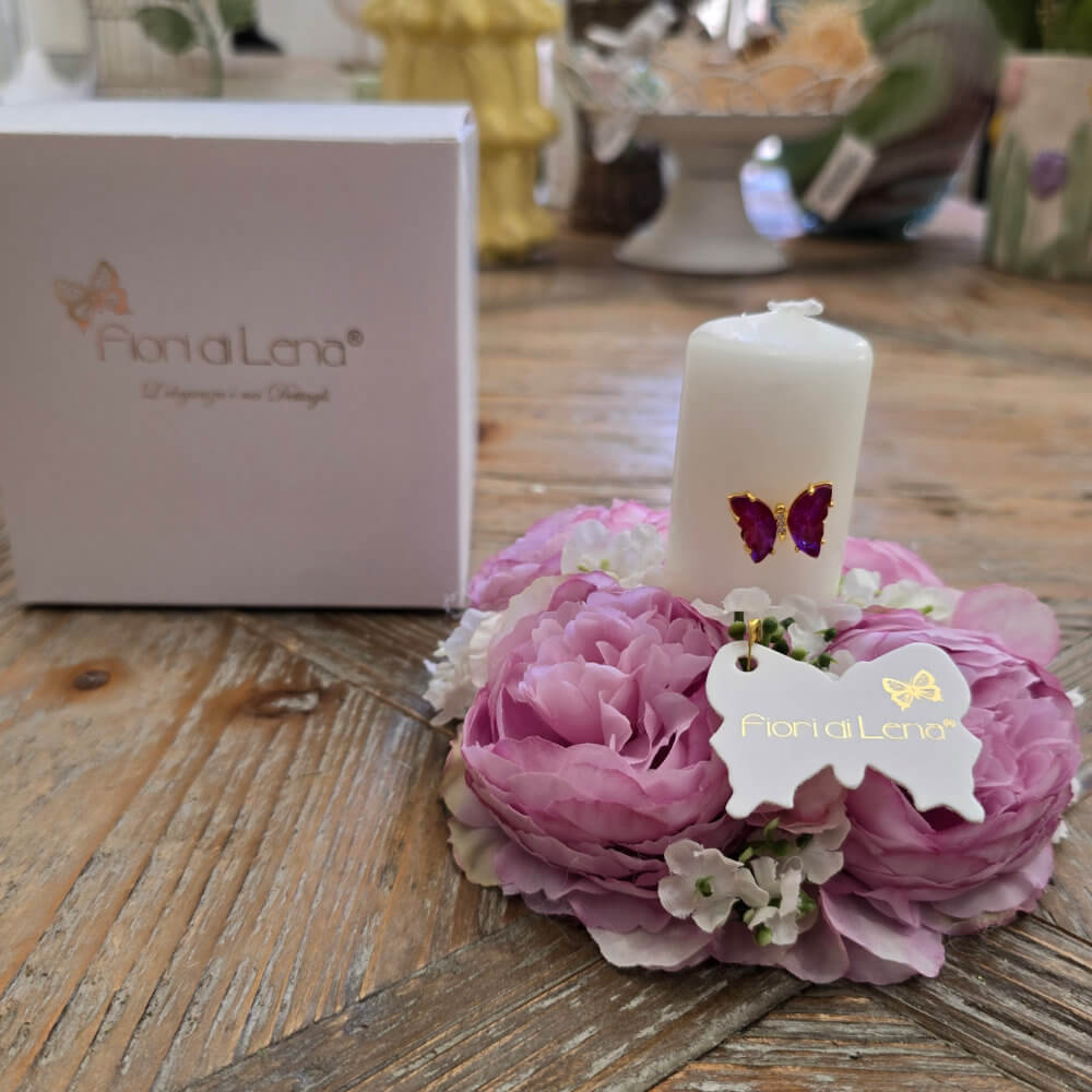 Une petite scène d’enchantement, où la lumière rencontre la délicatesse des fleurs. Cette couronne Fiori di Lena (Ø 14 x H 11 cm) enveloppe une bougie avec un papillon appliqué – symbole de légèreté et de renaissance – entre quatre renoncules couleur glycine, douces comme des pétales de soie. Les teintes lilas et poudrées s’entremêlent aux fleurs claires, créant un effet romantique et harmonieux, parfait dans le style Shabby Chic.