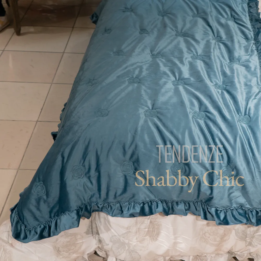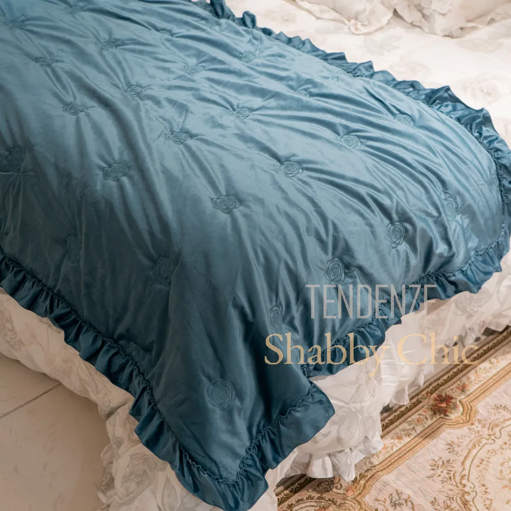 Sommier en velours brodé Ravello réalisé par L’Atelier 17 de couleur rose. La particularité est donnée par le volant présent sur les 4 côtés, il réchauffe pendant les nuits d’hiver et meuble avec romantisme et élégance.
