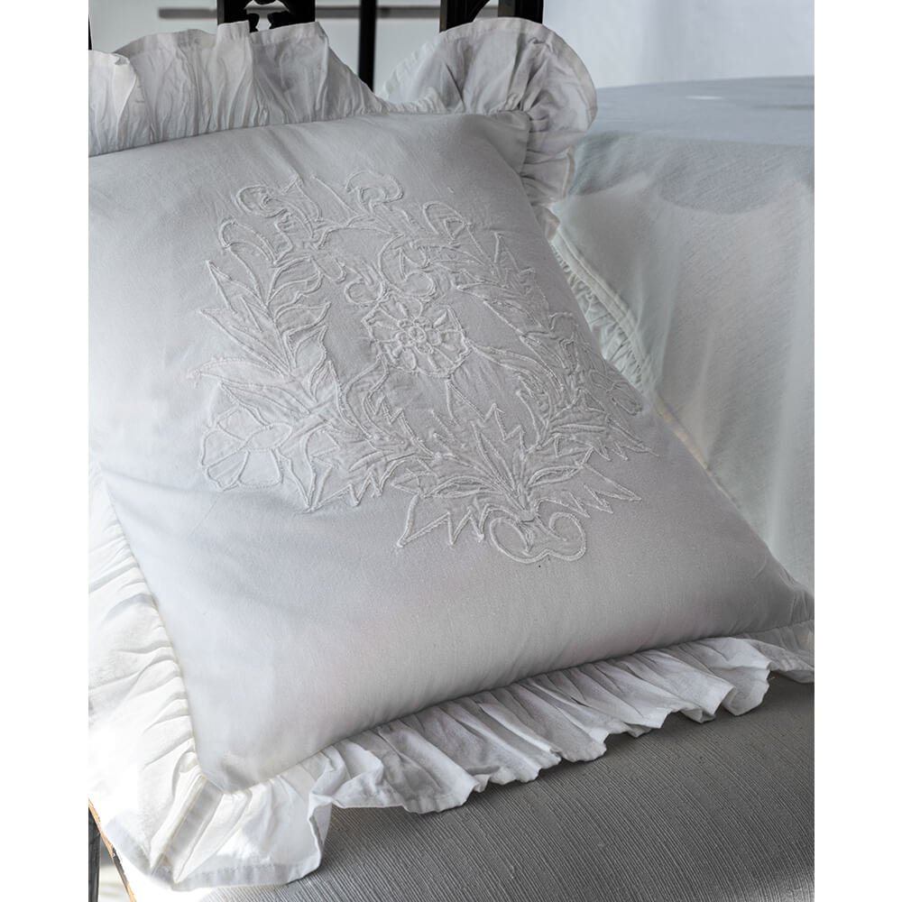 Réalisée en doux coton blanc, cette housse de coussin de L’Atelier 17 incarne le style intemporel de la collection Capodimonte. La broderie centrale ton sur ton représente un motif floral raffiné en relief, ce qui confère au tissu une valeur tridimensionnelle. Le volant froncé, appliqué sur tout le bord, ajoute une touche romantique et Shabby Chic, parfaite pour des ambiances délicates et féminines.