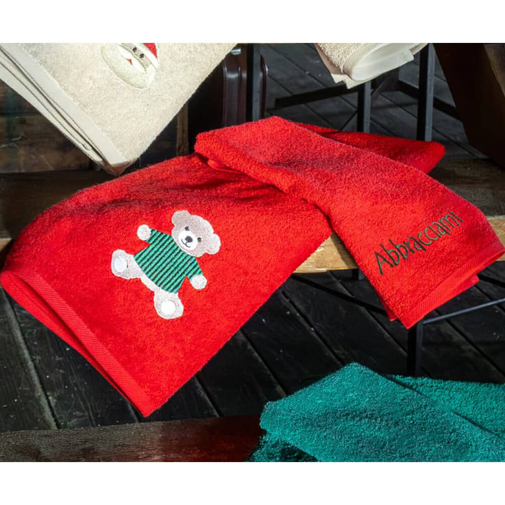 Set composé de 2 serviettes de Noël en éponge avec broderie ourson et inscription « Abbracciami » :