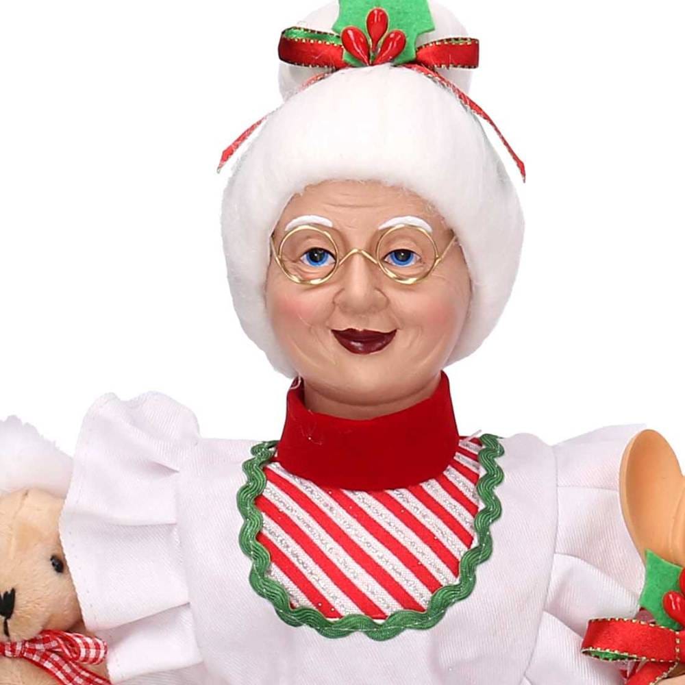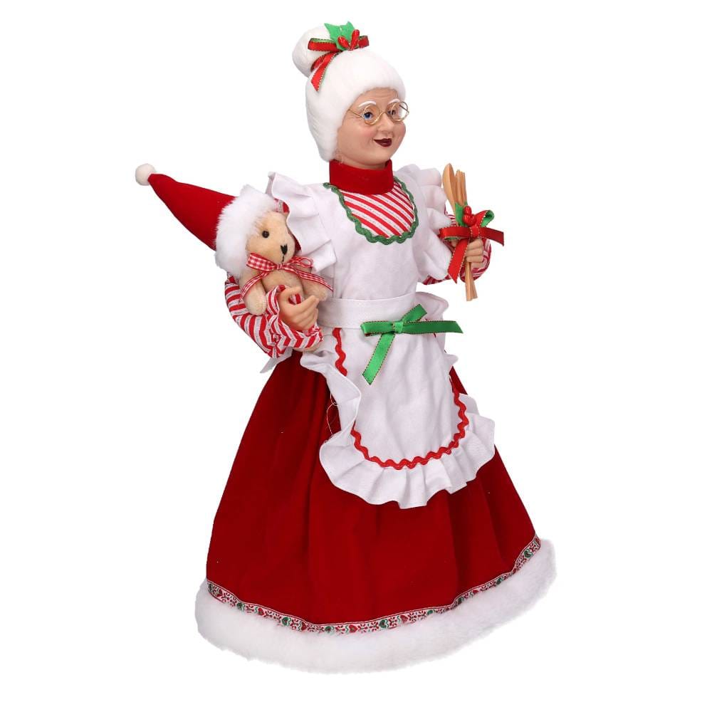 Faites entrer l’atmosphère chaleureuse et joyeuse de Noël dans votre maison grâce à cette charmante maman de Noël de 45 cm de haut. Fabriquée en tissu aux couleurs traditionnelles rouge, blanc et vert, elle porte un tablier décoré, tient un ours en peluche avec un bonnet de Noël et serre dans ses bras un ensemble de couverts en bois avec un nœud rouge.