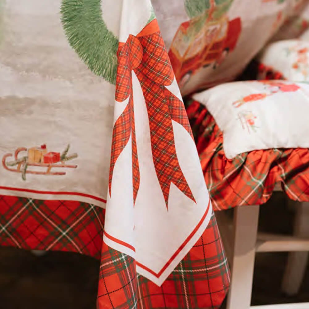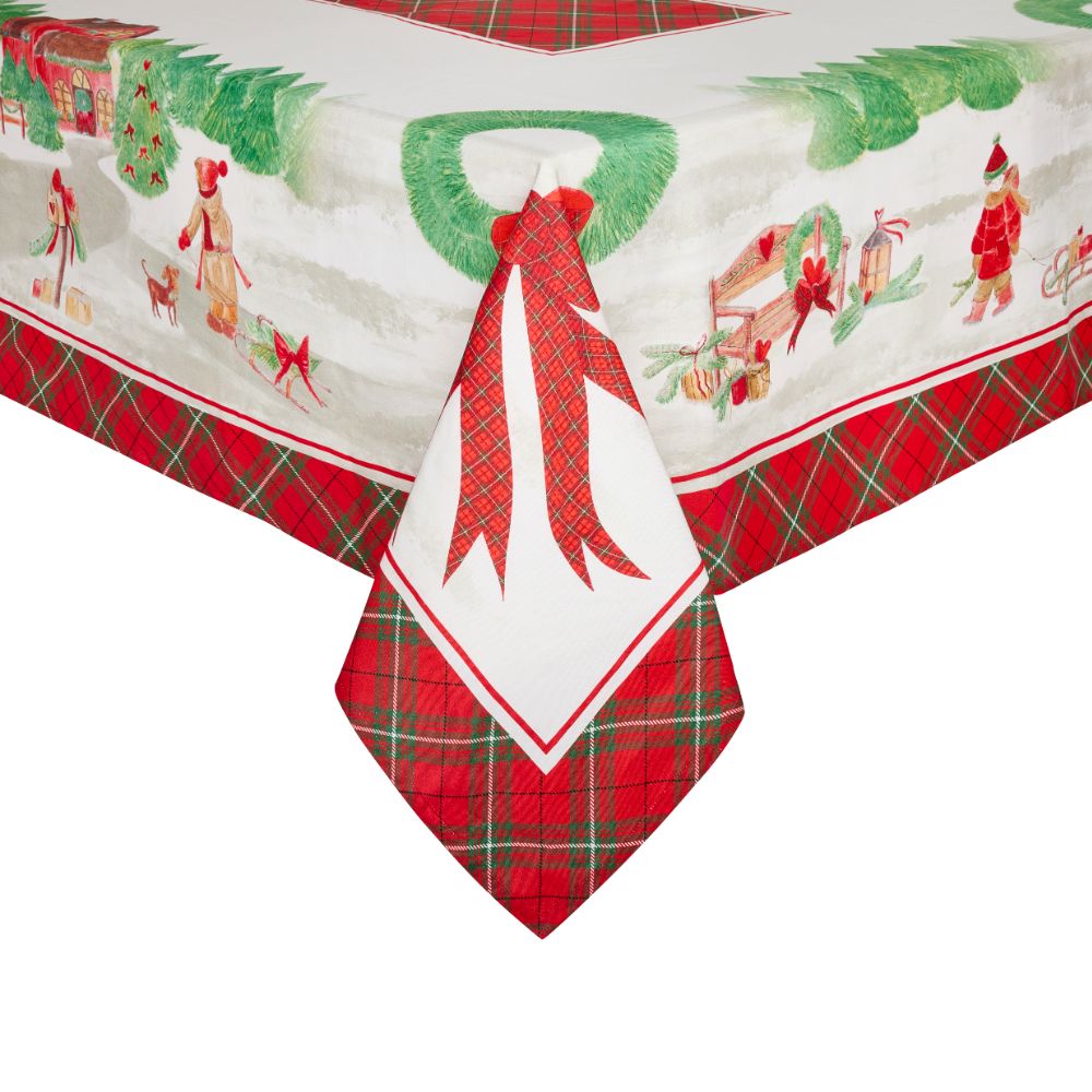 La bordure à carreaux rouges ajoute une touche classique et raffinée, tandis que les illustrations d’enfants, d’arbres de Noël et de cadeaux transmettent une sensation de chaleur et de tradition. Parfaite pour faire de chaque repas de fêtes un moment privilégié, cette nappe est non seulement un accessoire fonctionnel mais aussi un élément décoratif qui capture l’essence de Noël.