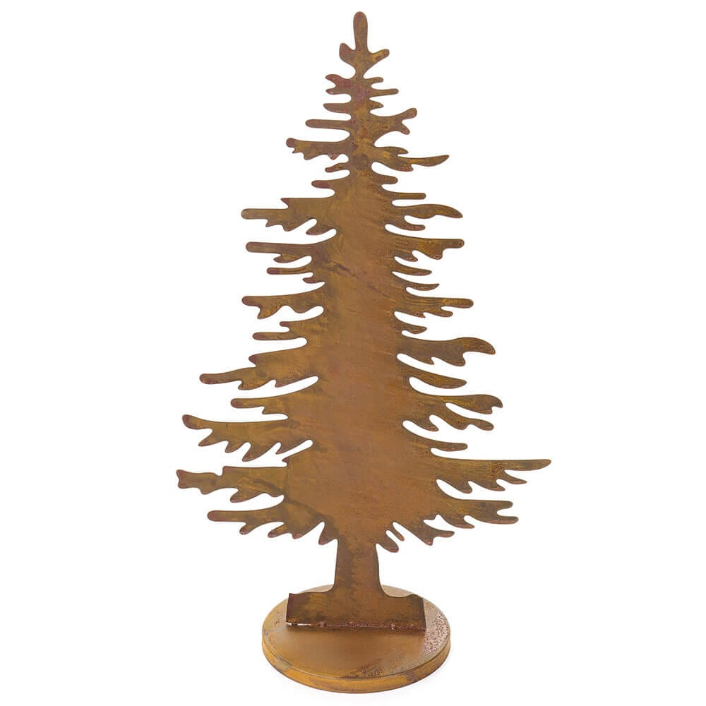 Arbre décoratif en métal avec finition corten effet rouille, silhouette perforée et base ronde stable. Parfait pour créer des scènes de Noël naturelles.