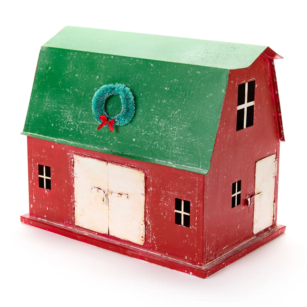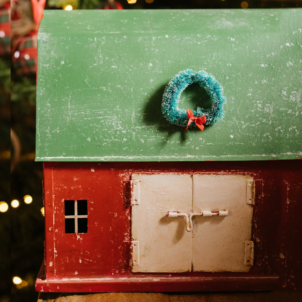 Grange en métal rouge avec toit vert décoré d’une couronne. Idéal pour décorer vos chambres pendant les vacances de Noël.