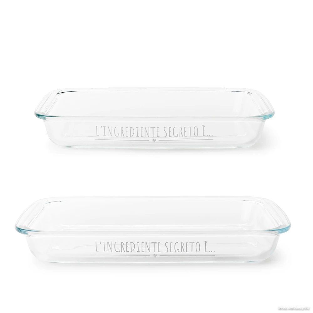 Plats à pâtisserie en verre borosilicate (résiste aux températures élevées) avec la mention « L’ingrédient secret est », disponibles en deux tailles. Ils font partie de la collection My Home conçue par Nuvole di Stoffa .