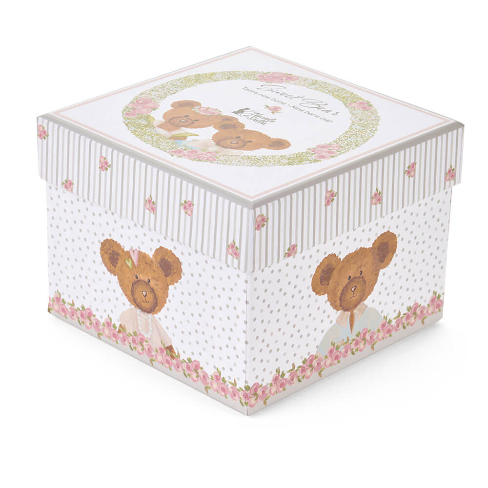 Tasse en porcelaine avec décoration Sweet Bear : un fond à délicats pois, un ourson sur le devant avec des petits cœurs pastel sur la tête et un liseré rose sur le contour. À la base, une guirlande de petites roses ajoute une touche romantique. La boîte cadeau est assortie, avec des rayures, des pois et un cadre floral : prête à être offerte (ou à être gardée pour soi).