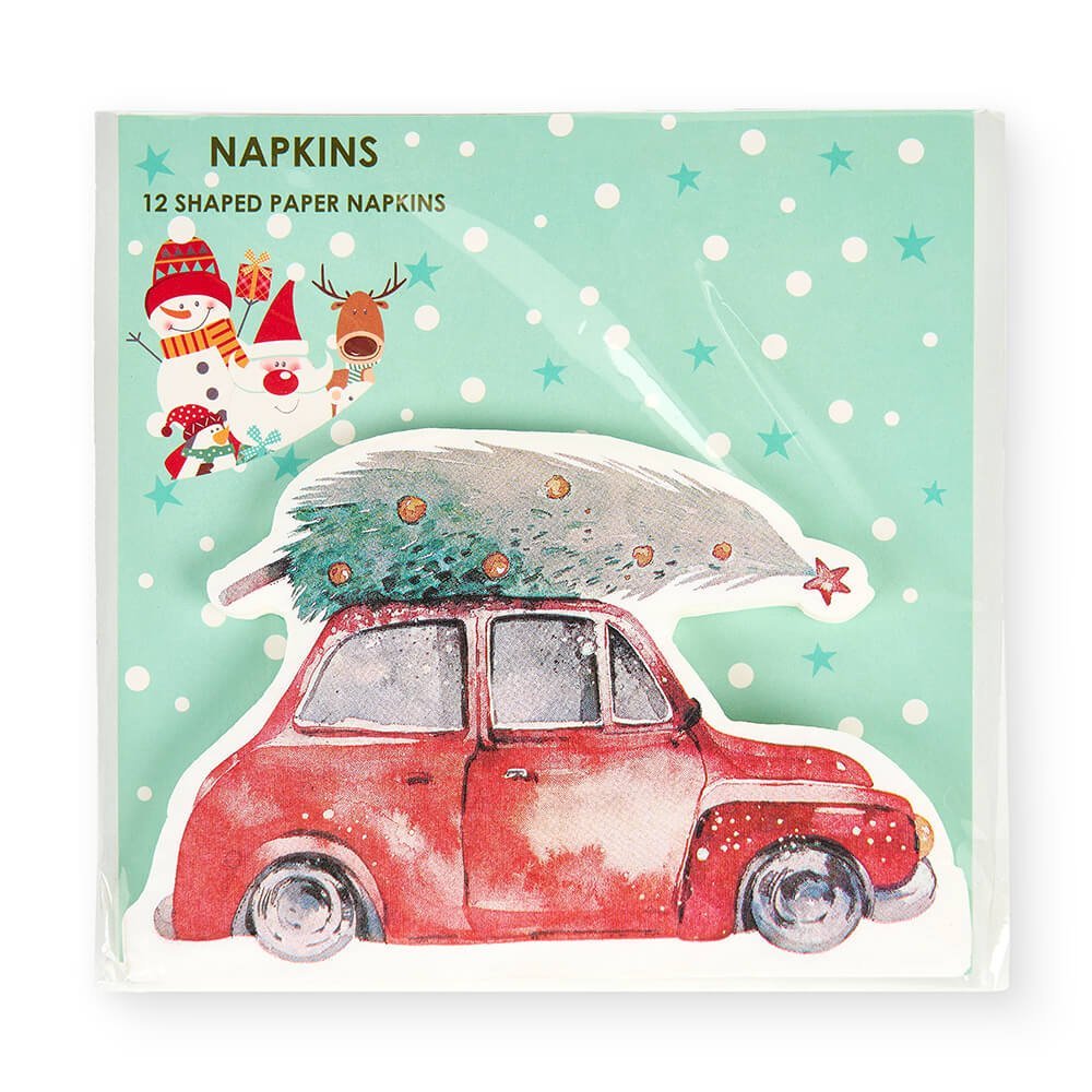 Paquet de 12 serviettes en papier (4 épaisseurs) en forme de voiture rouge avec sapin. Idéal pour une mise en place informelle pendant les vacances de Noël. Dimensions : 33×33 cm