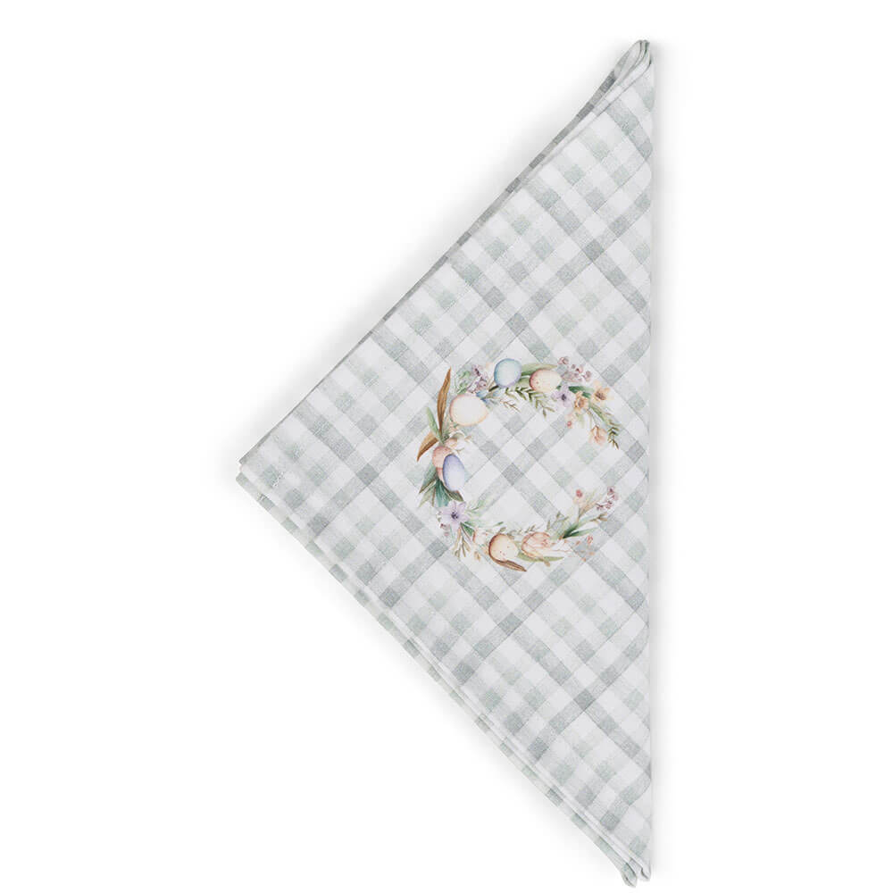 La serviette de table en coton PePen de Nuvole di Stoffa est conçue pour embellir la table avec un style délicat et intemporel. Réalisée en coton doux, elle présente un fond classique à carreaux vert sauge qui rappelle l’esthétique shabby chic. La décoration centrale, une guirlande raffinée avec des œufs de Pâques et des branches fleuries, ajoute une touche printanière élégante et discrète. Parfaite pour la mise en place de Pâques, elle se marie harmonieusement avec les nappes, chemins de table et coussins de chaise de la même collection, créant ainsi un ensemble coordonné et impressionnant.