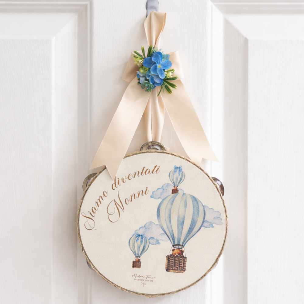 Tambourin de naissance Madame Fioccò avec illustration de montgolfières en bleu clair et l’inscription Nous sommes devenus grands-parents.