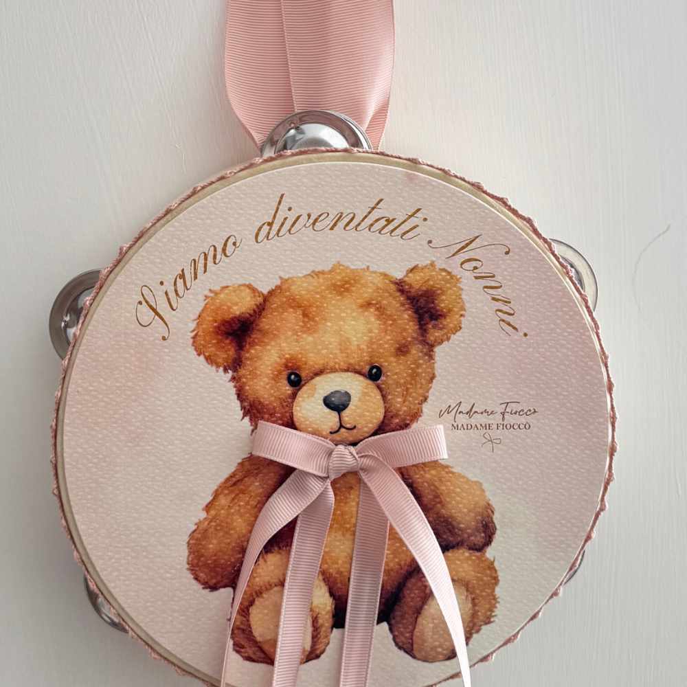 Le Tambourin Teddy Tendresse raconte la joie de l’arrivée avec un message dédié aux grands-parents. Le graphisme avec nounours sur fond rose est accompagné de l’inscription Nous sommes devenus grands-parents, pour une annonce au ton doux et romantique, en harmonie avec un environnement shabby Chic.