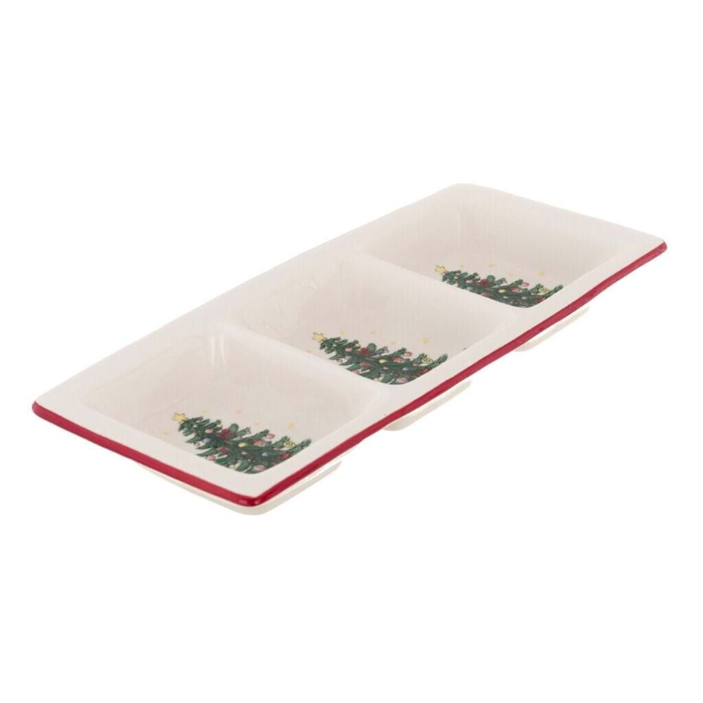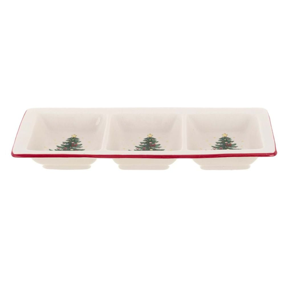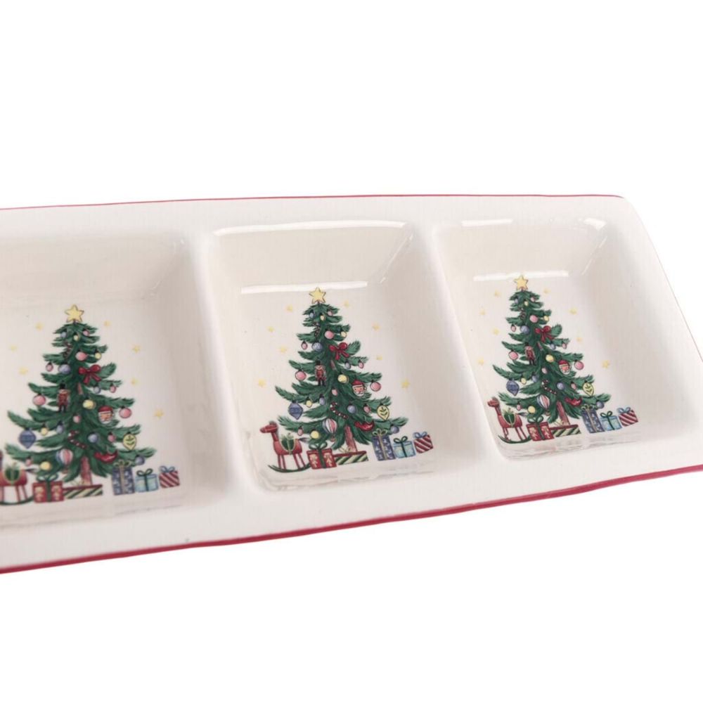 Trio saucière de Noël en céramique blanche à décor de sapin de Noël et liseré rouge