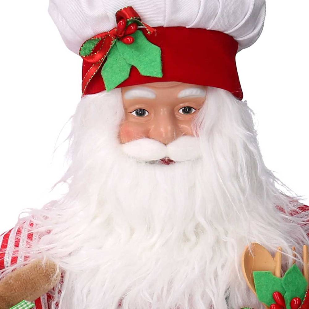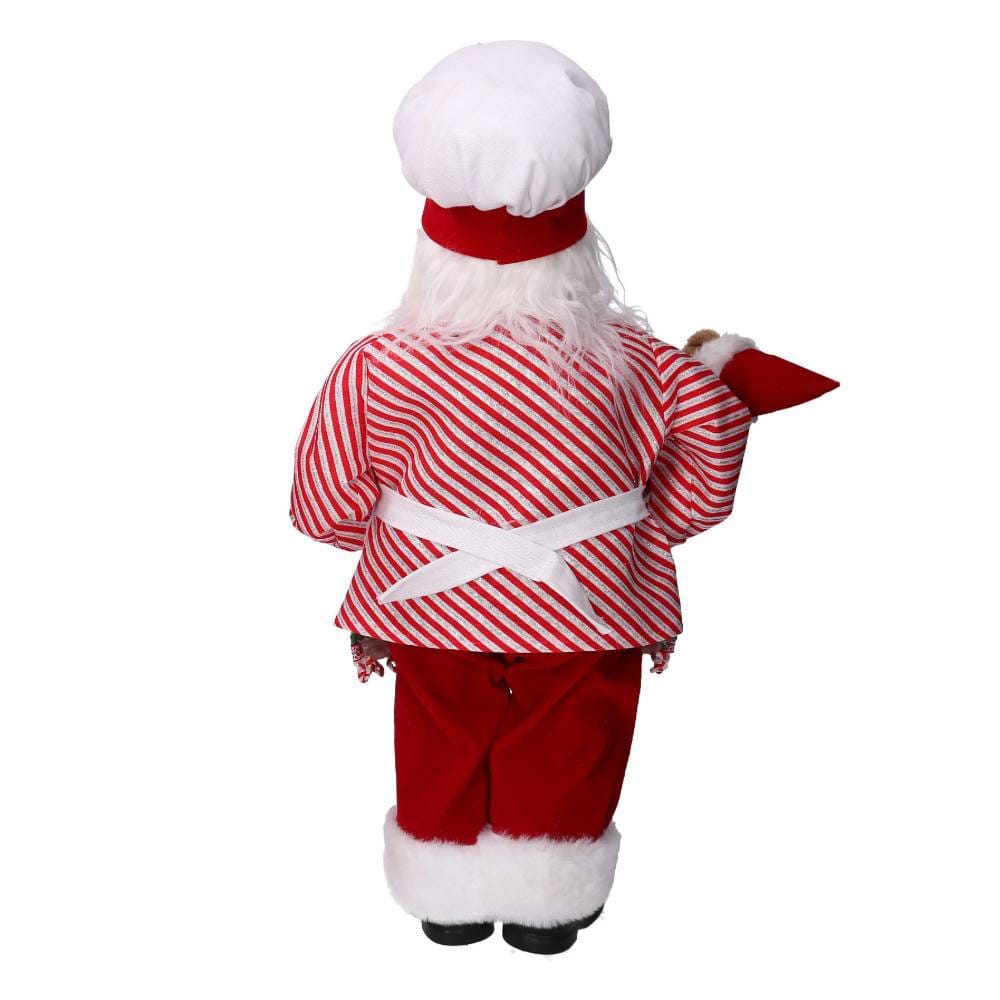 Il cappello da cuoco e i dettagli in stile candy cane rendono questo Babbo un protagonista perfetto per ambienti allegri e accoglienti.