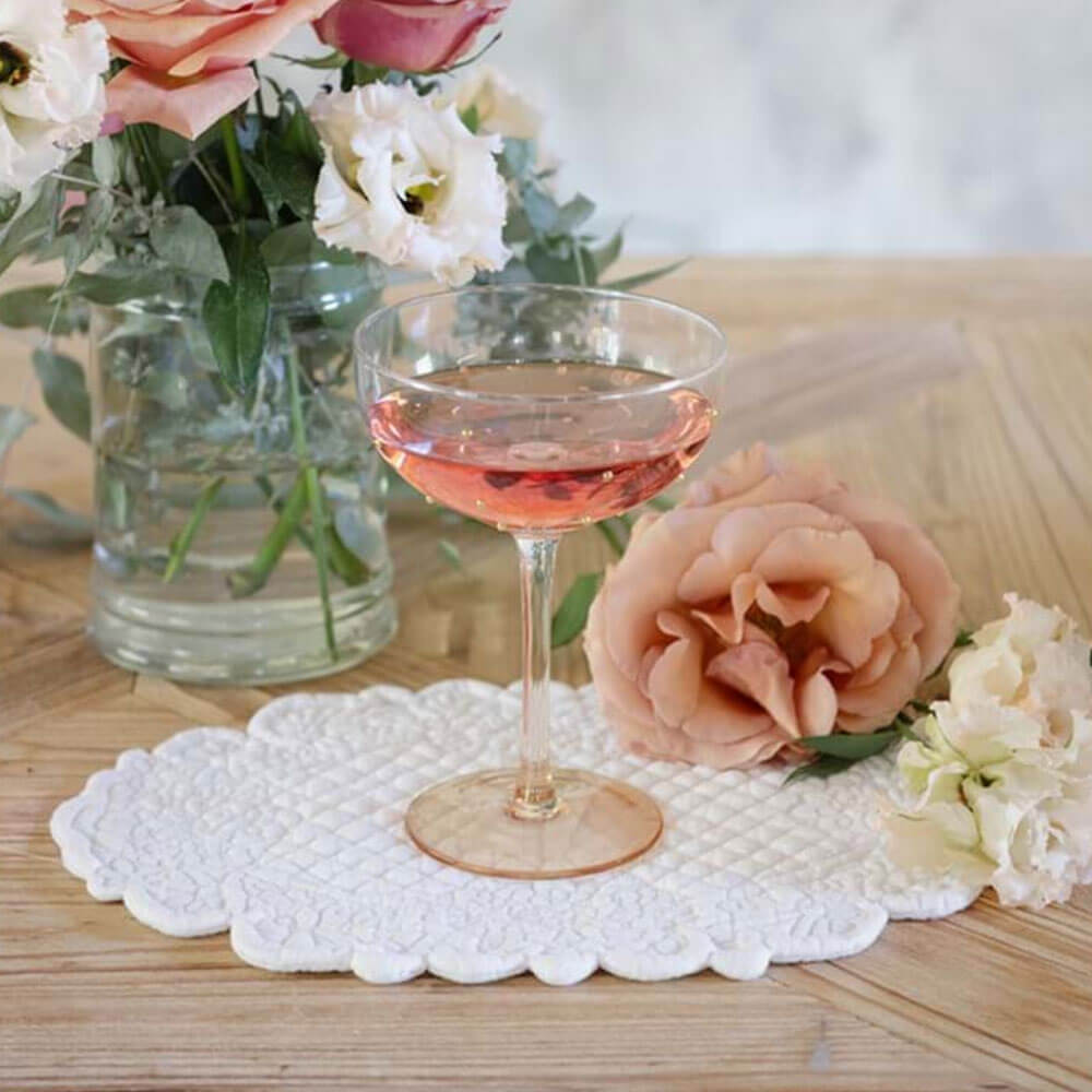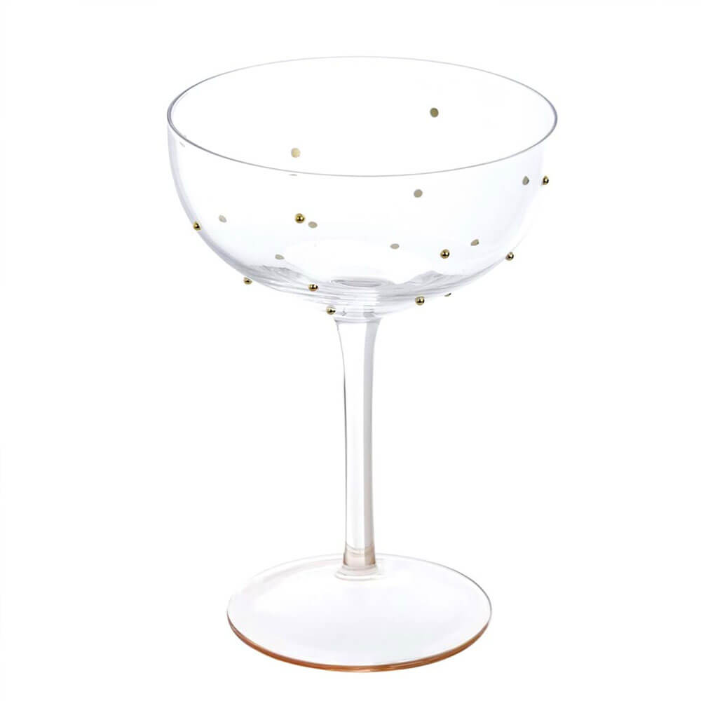 Il calice coppetta Blanc Mariclo della collezione Vitra è realizzato in vetro trasparente finemente decorato con piccoli pois dorati, applicati con eleganza per creare giochi di luce delicati. La forma a coppetta dona un tocco retrò e femminile, mentre la base leggermente ambrata aggiunge calore e raffinatezza all’insieme. Ideale per cocktail, champagne o dessert al cucchiaio, è perfetto per una tavola romantica, shabby chic o per occasioni speciali curate nei minimi dettagli.