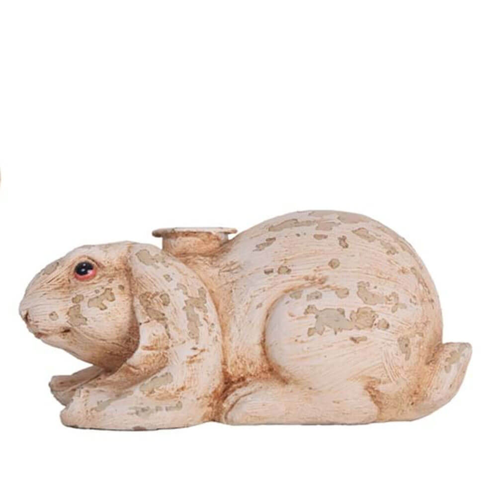 Candelabro in resina effetto shabby a forma di coniglietto, con finitura anticata e dettagli scolpiti. Collezione Cortile.