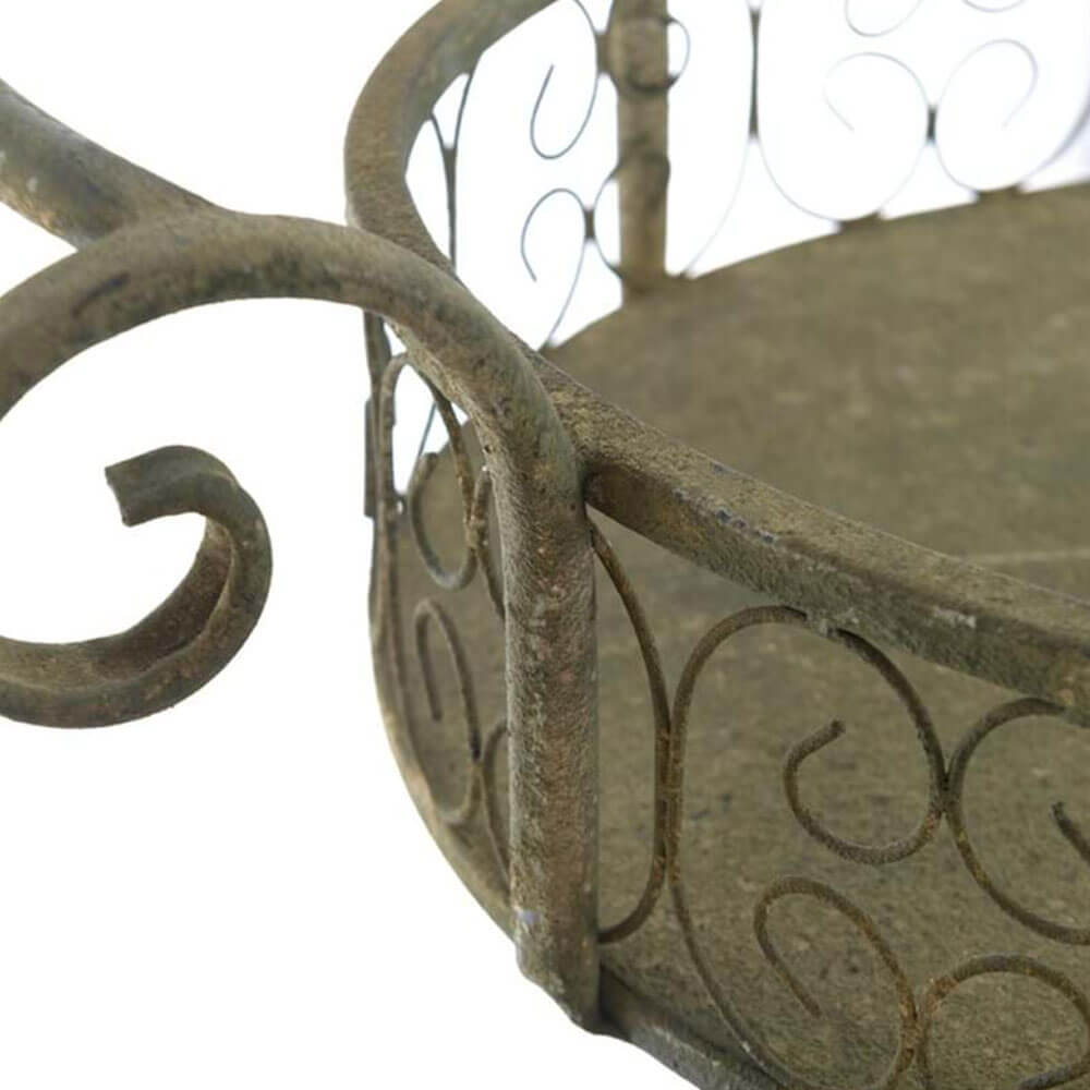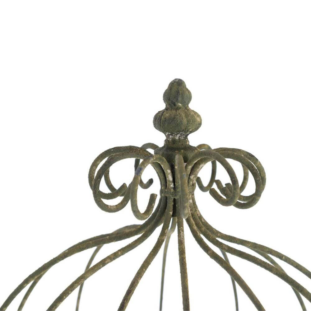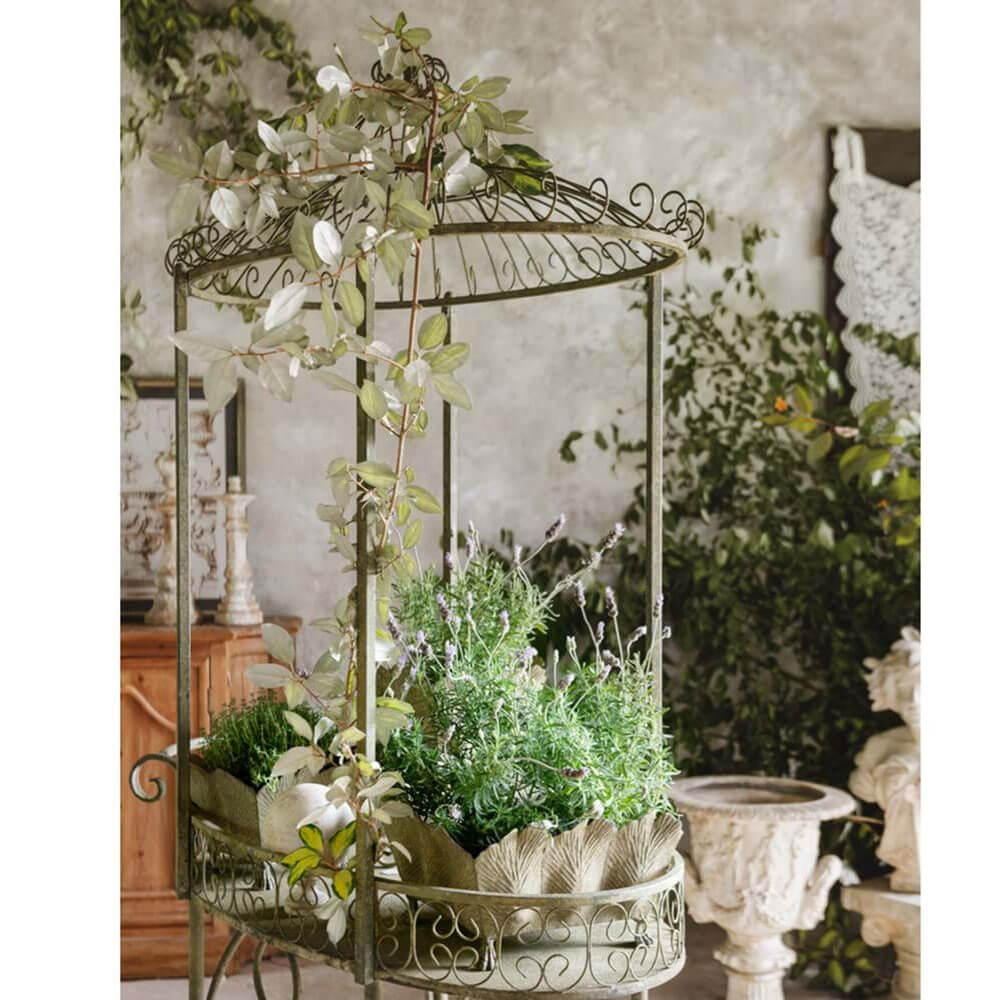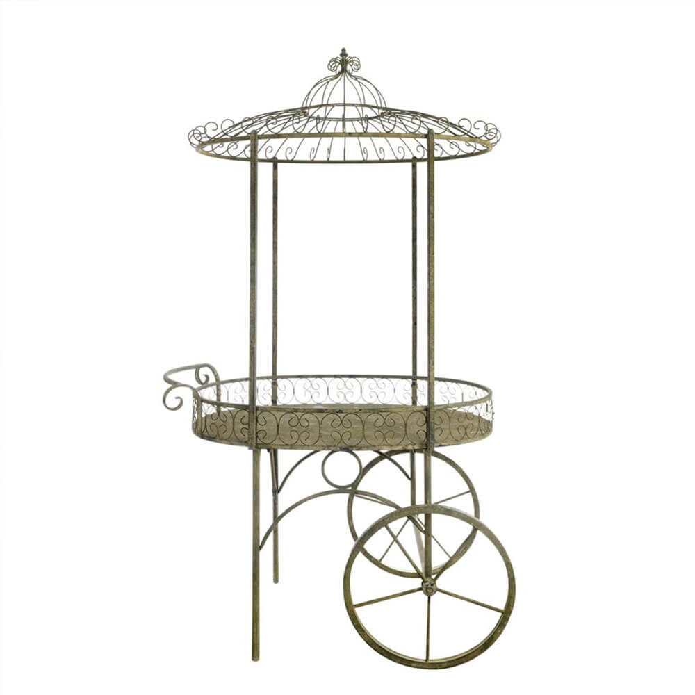 Interamente realizzato in metallo con finitura antichizzata, presenta una cupola a gabbia in ferro lavorato, ruote scenografiche e bordature arricciate lungo tutto il perimetro del piano d’appoggio. Ogni dettaglio richiama lo stile francese rétro, rendendolo ideale come espositore per fioriere, bomboniere, dolci o composizioni floreali.