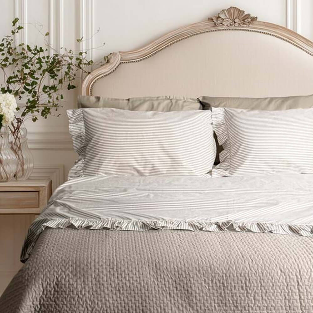 Il completo letto della collezione Dolci Righe firmato Blanc Mariclò si distingue per il suo design raffinato e senza tempo. Le righe beige su fondo bianco conferiscono un tocco sobrio e chic, mentre la balza arricciata aggiunge un dettaglio decorativo romantico. Realizzato in 100% cotone, è traspirante e piacevole al tatto, perfetto per il riposo quotidiano.