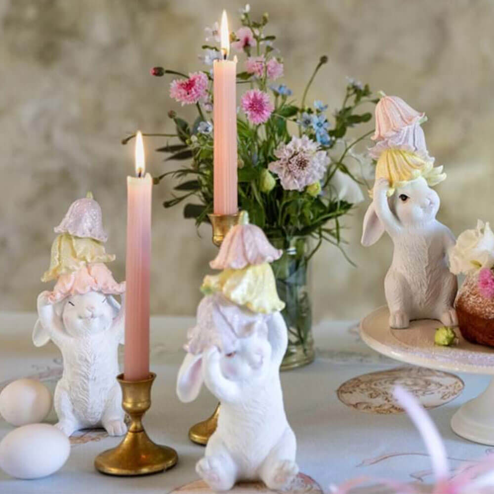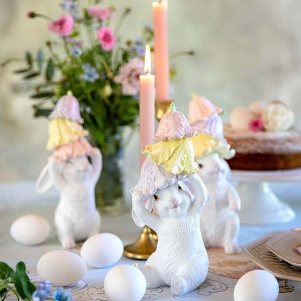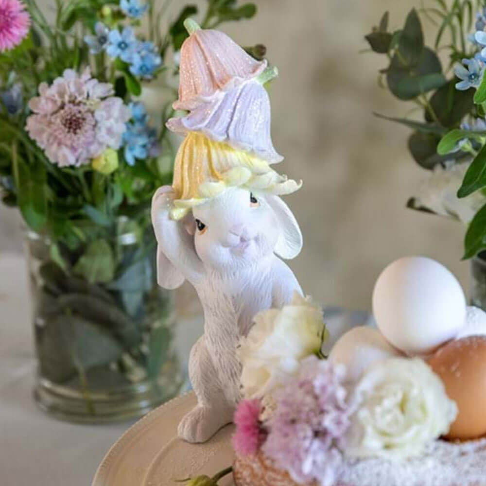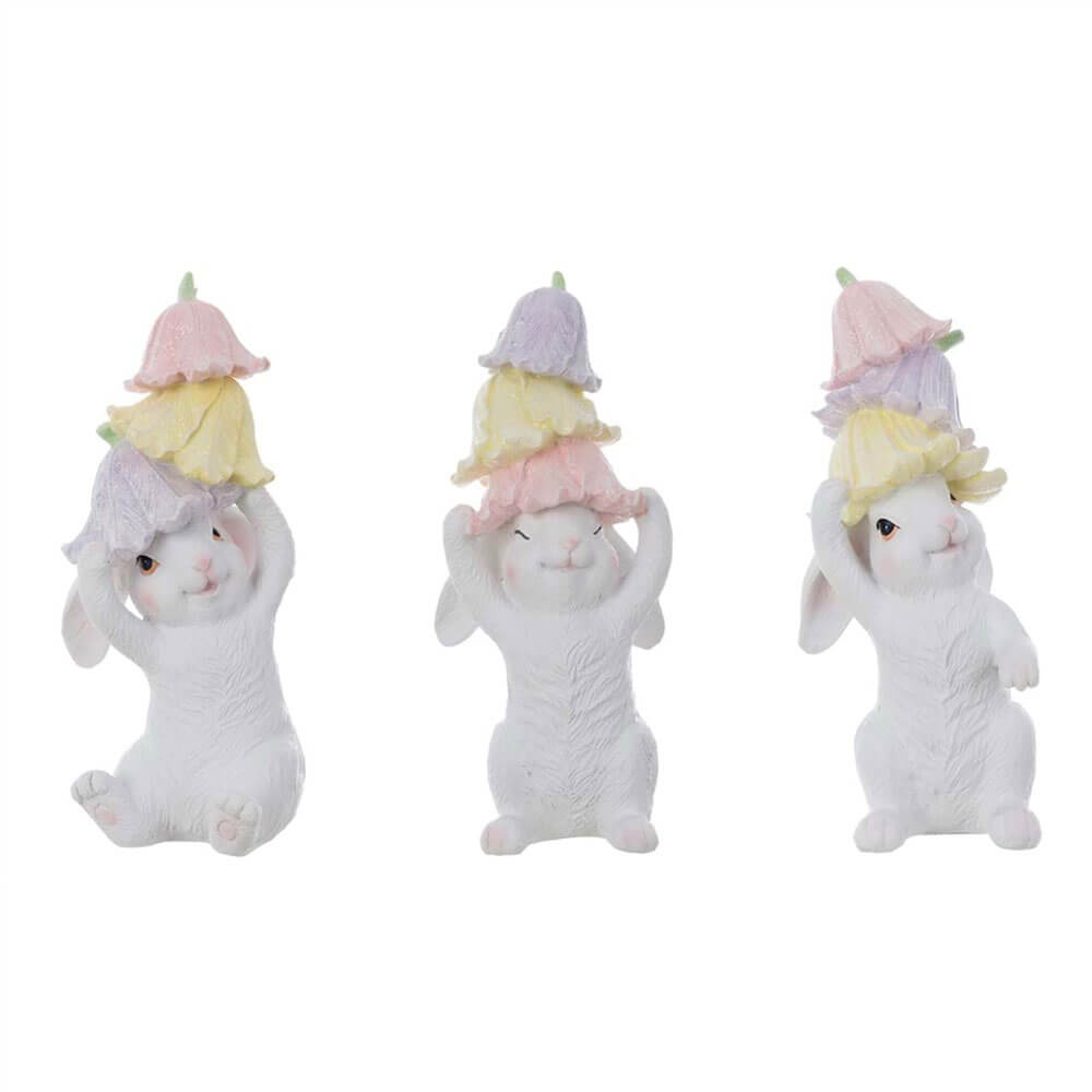 Coniglietto in resina con cappello di fiori pastello glitterati. Tre pose assortite. Collezione Dolce Fiaba.