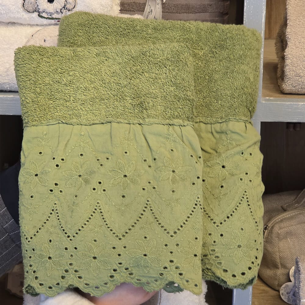 Il loro design è impreziosito da una balza in pizzo sangallo tinta in capo, un dettaglio decorativo che dona un aspetto vintage e sofisticato. La raffinata tonalità oliva li rende perfetti per aggiungere un tocco naturale e ricercato al tuo bagno, ideale per ambienti shabby chic o rustici eleganti.