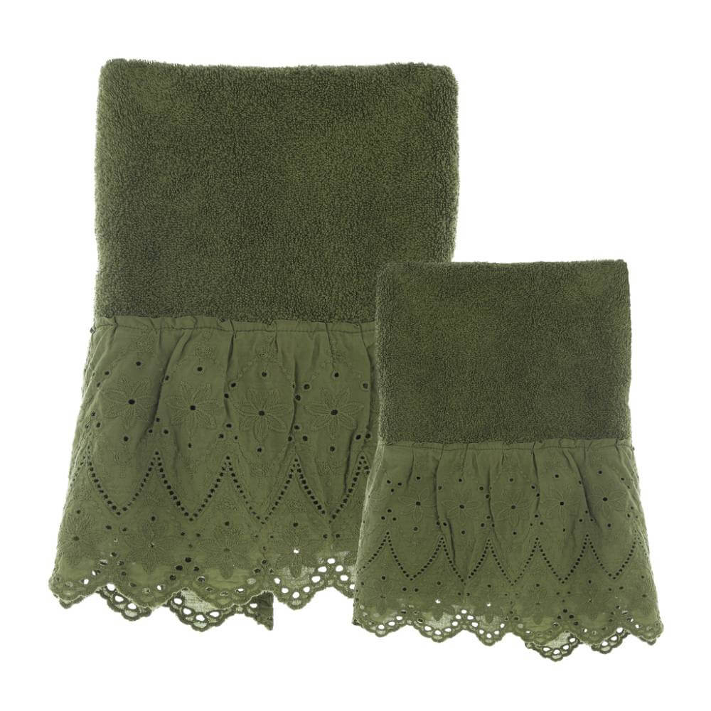 La balza in pizzo sangallo tinta in capo è il dettaglio distintivo che dona un tocco elegante e ricercato, perfetto per ambienti bagno shabby chic o rustici. La tonalità verde, ispirata alla natura, si abbina con armonia a diversi stili di arredamento.