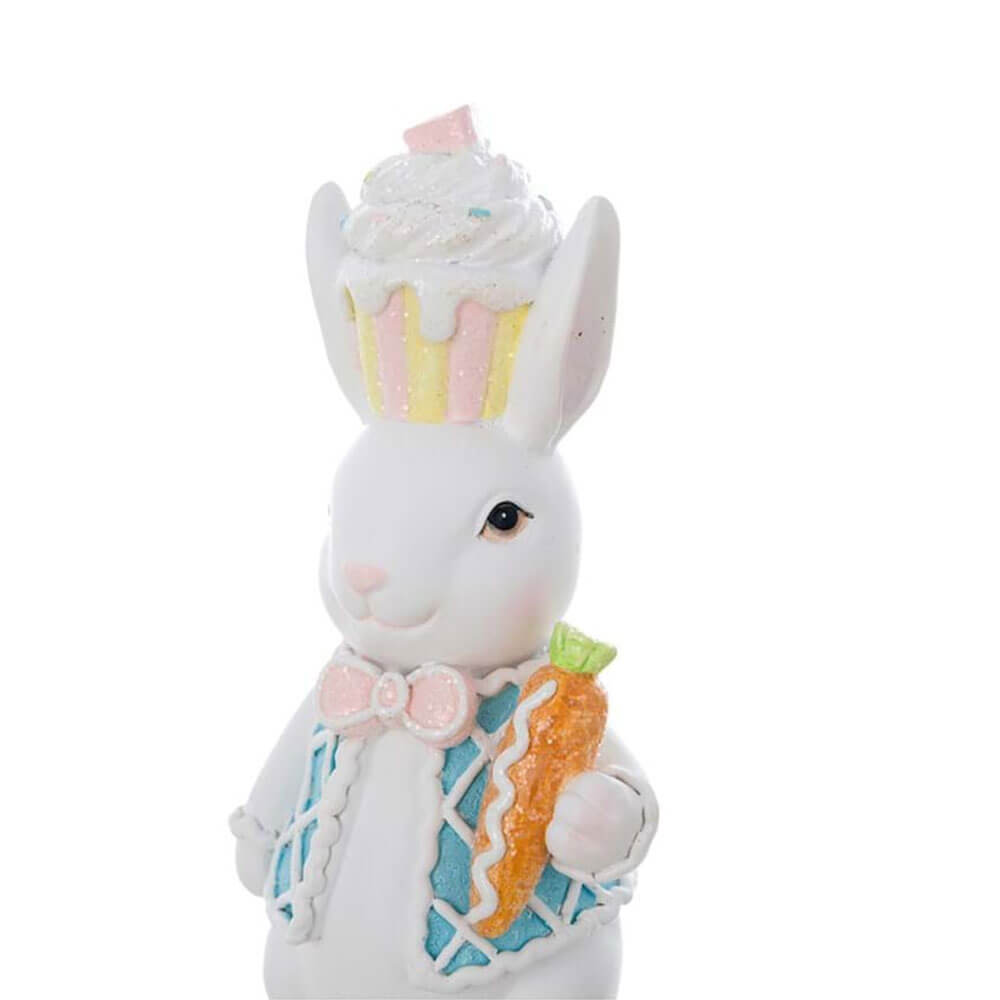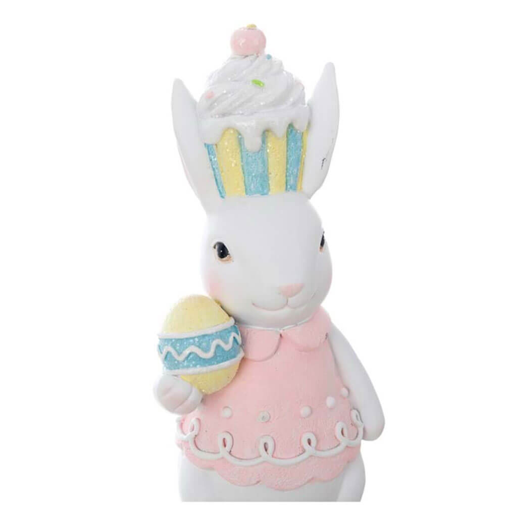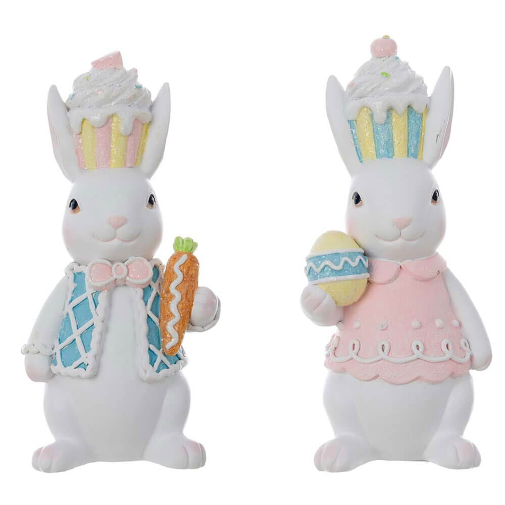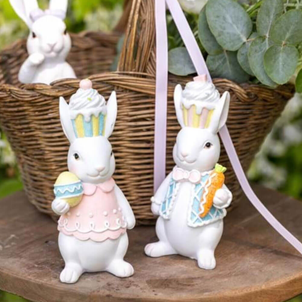 La Coppia Coniglietti della collezione Dolce Fiaba Blanc Mariclò è una decorazione irresistibile per la Pasqua e la primavera. Realizzati in resina glitterata, i due simpatici conigli sono riccamente dettagliati: uno indossa un gilet celeste con papillon e tiene in mano una carota decorata, l’altro sfoggia un vestitino rosa e regge un uovo pasquale pastello. Entrambi portano sulla testa un ironico cappello a forma di cupcake zuccherato.