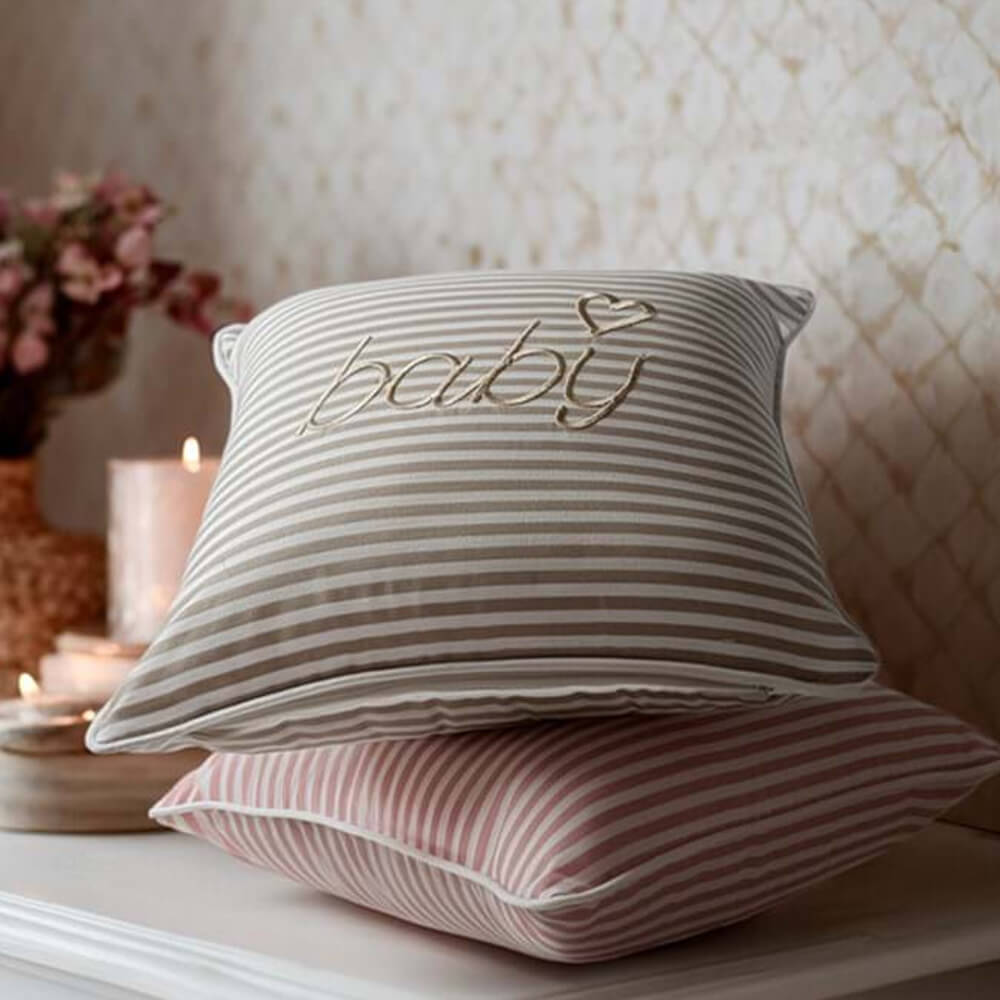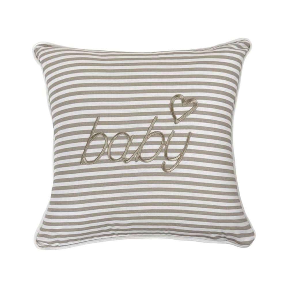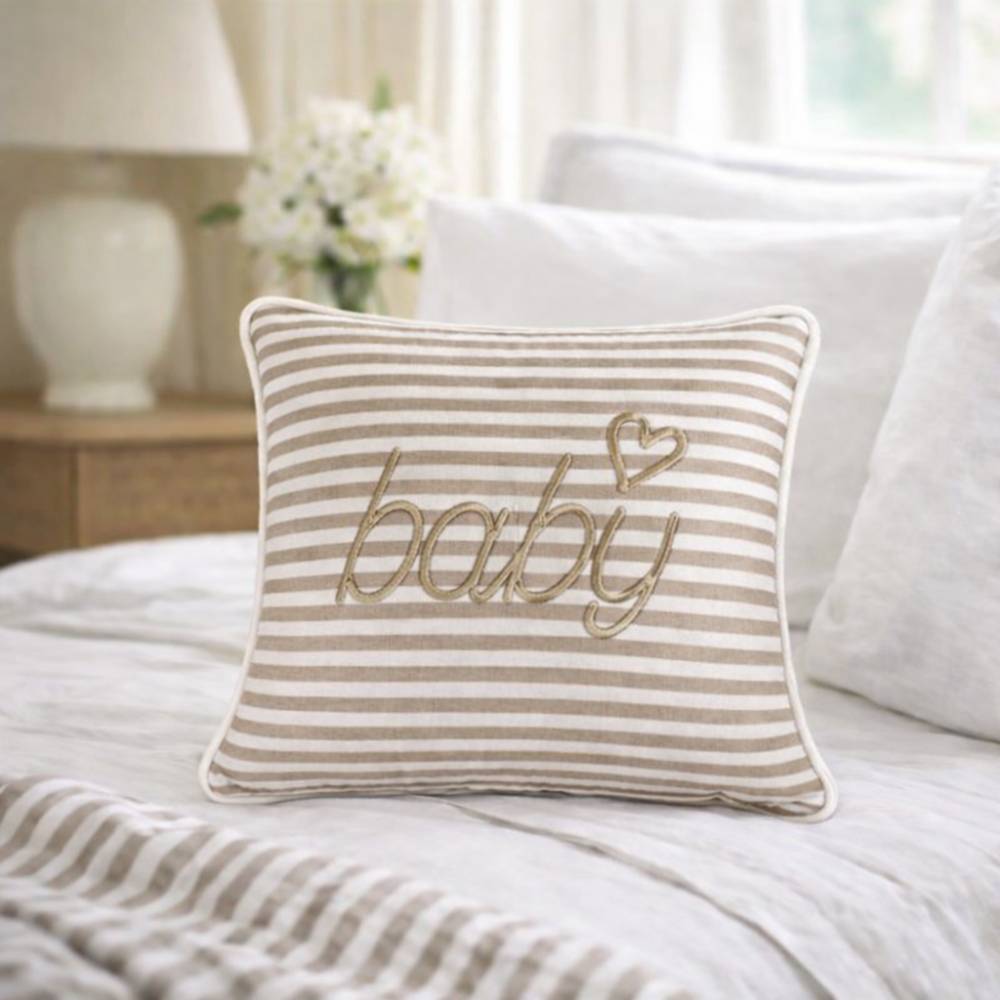 Aggiungi un tocco di dolcezza alla cameretta con il cuscino Baby di Blanc Mariclò. Realizzato in 100% cotone, presenta un’elegante fantasia a righe beige e bianche, con la delicata scritta “baby” ricamata accompagnata da un cuoricino. Il profilo con bordo a cordoncino aggiunge una finitura curata e raffinata. Ideale per decorare la culla, il lettino o una poltroncina, questo cuscino è anche una splendida idea regalo per una nascita o un baby shower.