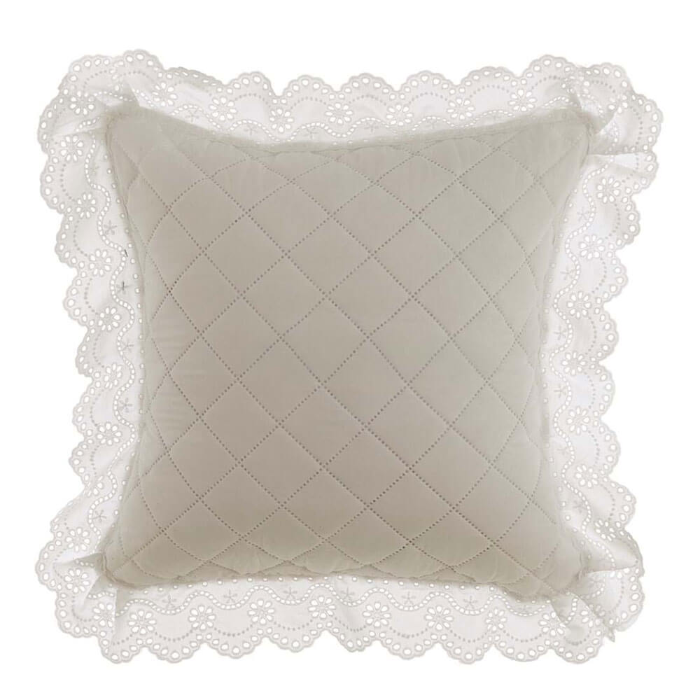 Cuscino quadrato in microfibra color naturale trapuntata a rombi con ampia gala in pizzo sangallo traforato, dallo stile romantico e raffinato.