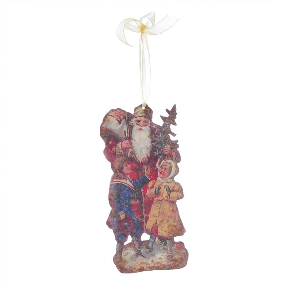 Un piccolo capolavoro d’altri tempi: la decorazione da appendere Serenata d’Inverno di Blanc Mariclò raffigura Santa Claus circondato da bambini in abiti retrò. Realizzata in metallo sottile, presenta un design illustrato in stile vintage con colori caldi e sfumature invecchiate.