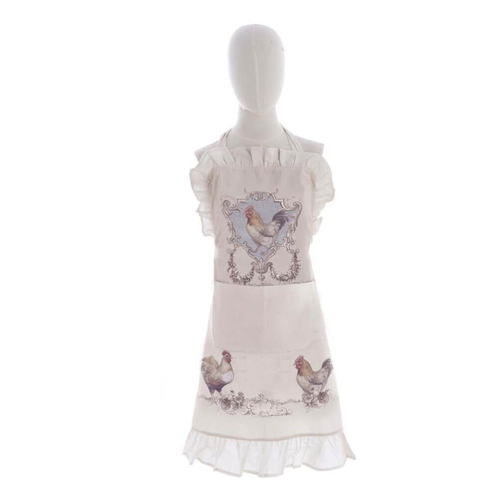 Il grembiule Blanc Mariclò della collezione COCO è realizzato in 100% cotone e impreziosito da una delicata stampa con galline in stile country chic. Il design romantico è arricchito da cornici ornamentali e da raffinati volant applicati sullo scollo e sul fondo, che donano movimento e femminilità. Le tonalità chiare e polverose lo rendono ideale per cucine shabby, provenzali o classiche. Funzionale e decorativo, è perfetto per cucinare con stile o come idea regalo coordinata alla collezione.