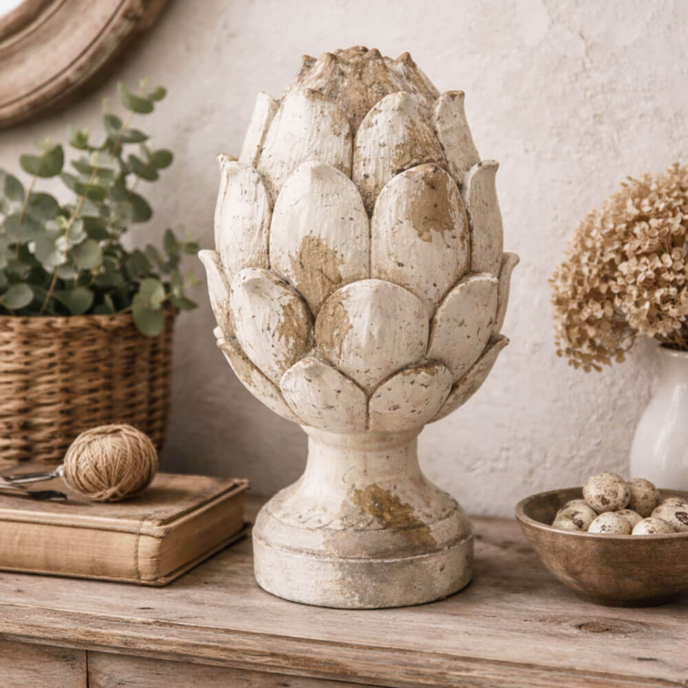 La pigna decorativa Blanc Mariclò della collezione Antiqua Domus è un pezzo scenografico che richiama l’eleganza delle ville storiche e dei giardini antichi. Con una struttura importante e un diametro di 29 cm, è realizzata in resina con una patina color beige e oro effetto decapato, che conferisce un aspetto vissuto e sofisticato. Perfetta per valorizzare caminetti, ingressi, librerie o consolle, dona un tocco di raffinatezza e memoria ai tuoi ambienti.