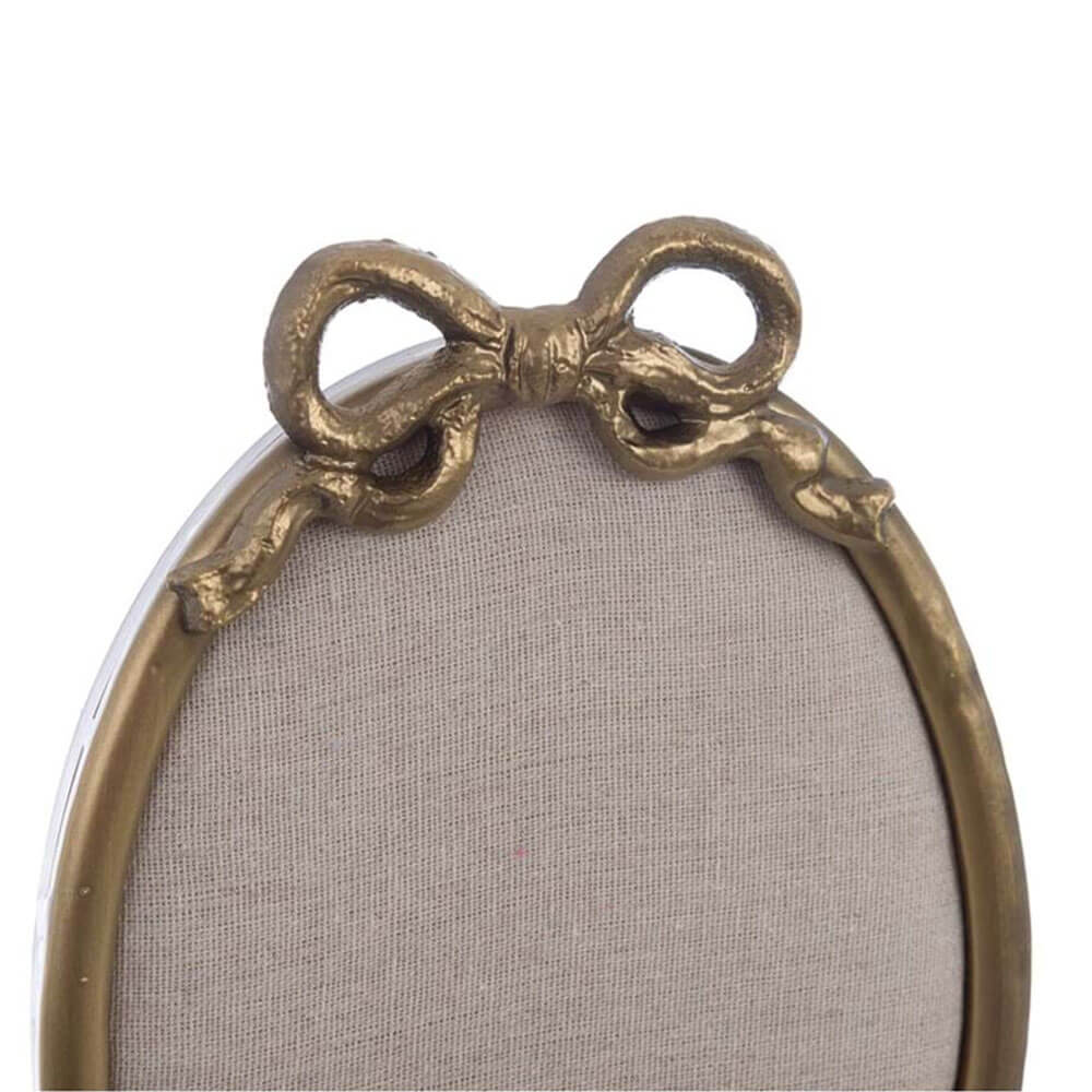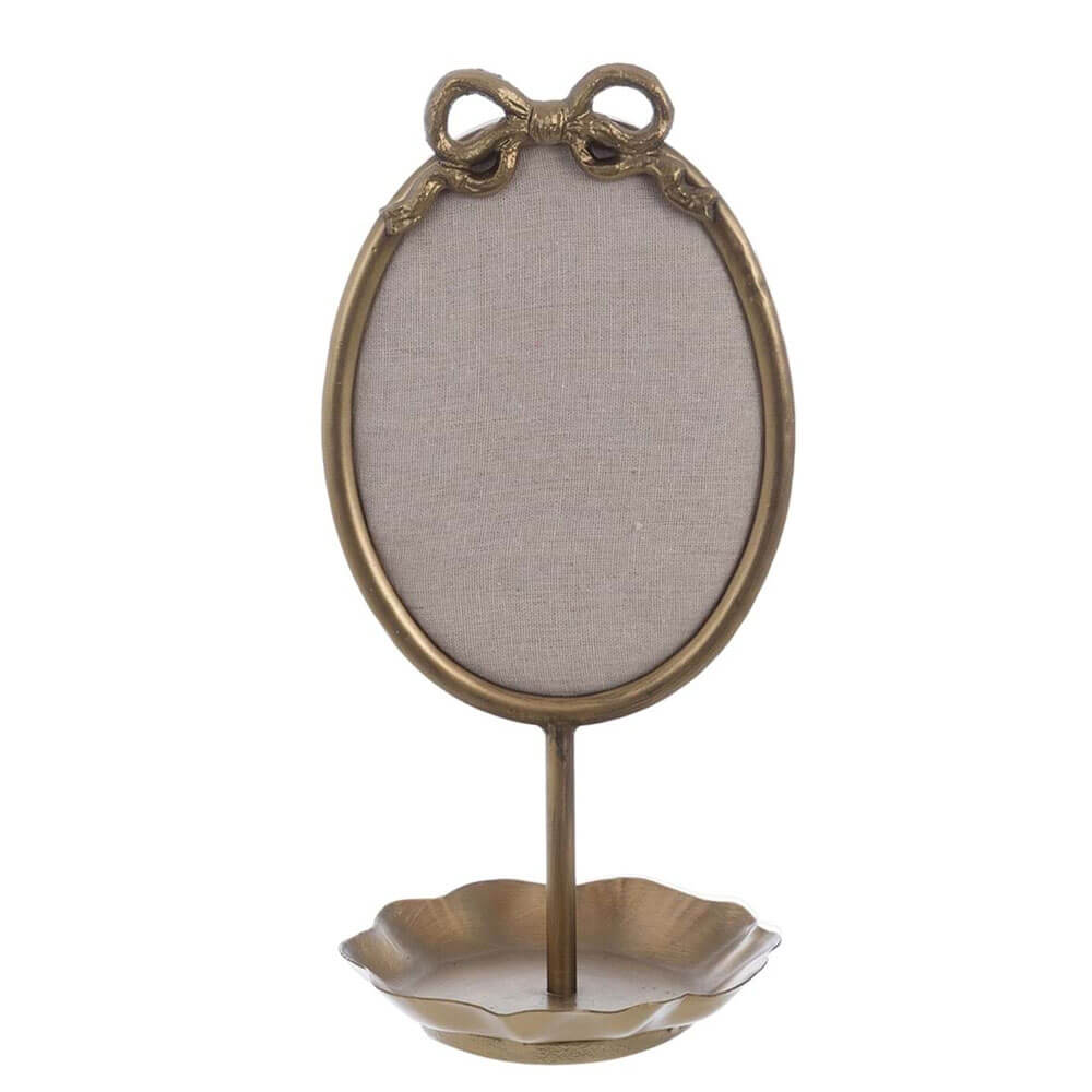 Porta gioielli da tavolo con cornice in metallo dorato, fiocco decorativo e base svuota-tasche.