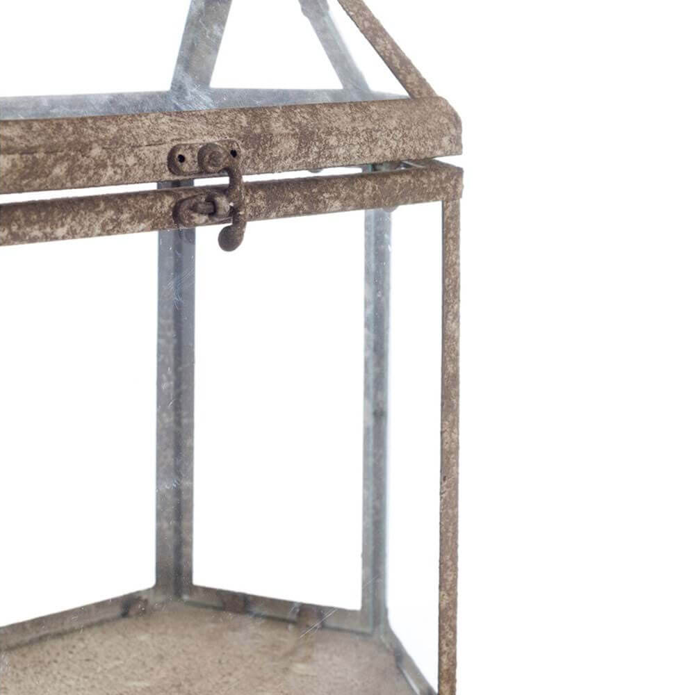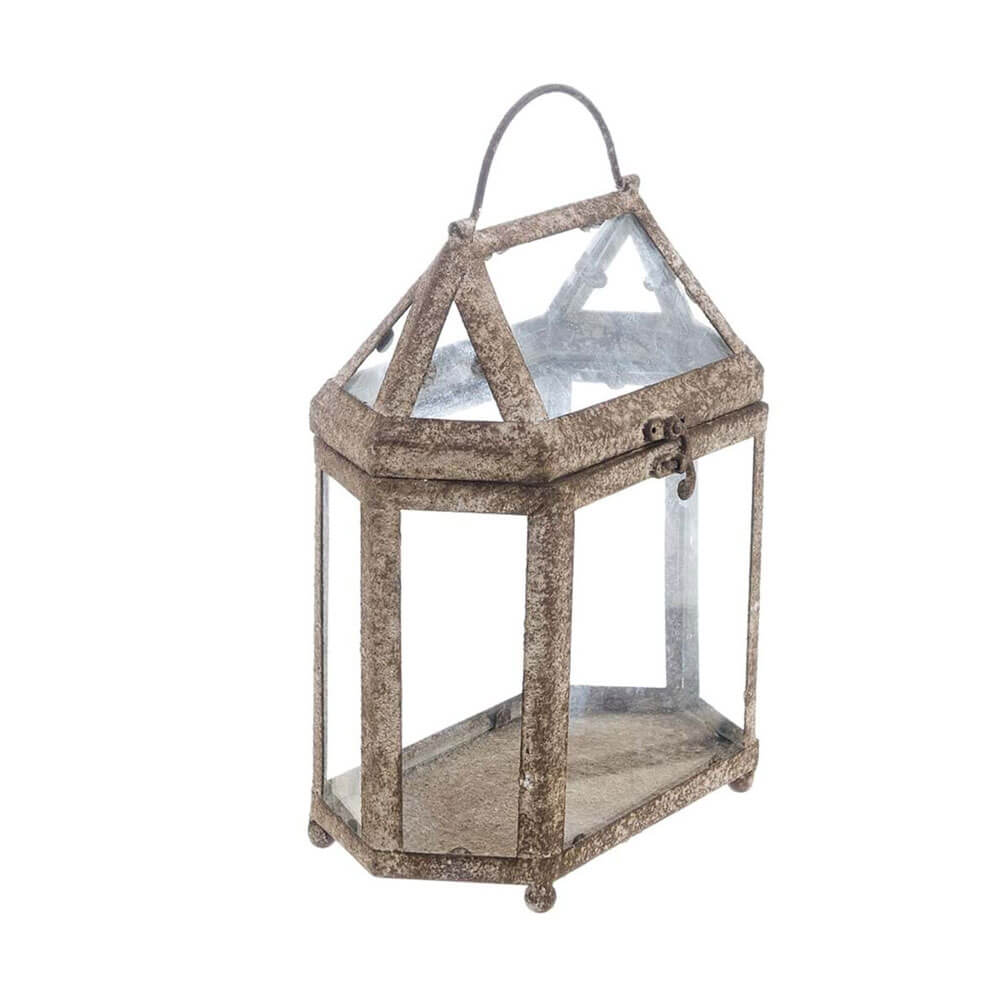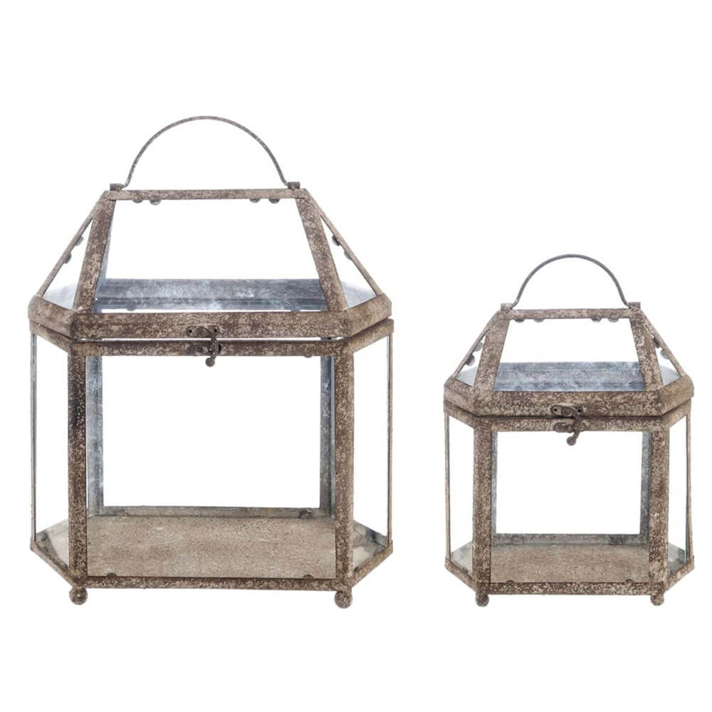 Questo raffinato set di 2 lanterne firmato Blanc Mariclò unisce eleganza vintage e funzionalità. Realizzate in ferro con inserti in vetro trasparente, presentano una silhouette esagonale con tetto inclinato e manico ad arco. La superficie anticata, dall’effetto ruggine naturale, conferisce un aspetto vissuto e romantico, perfetto per ambienti shabby chic.