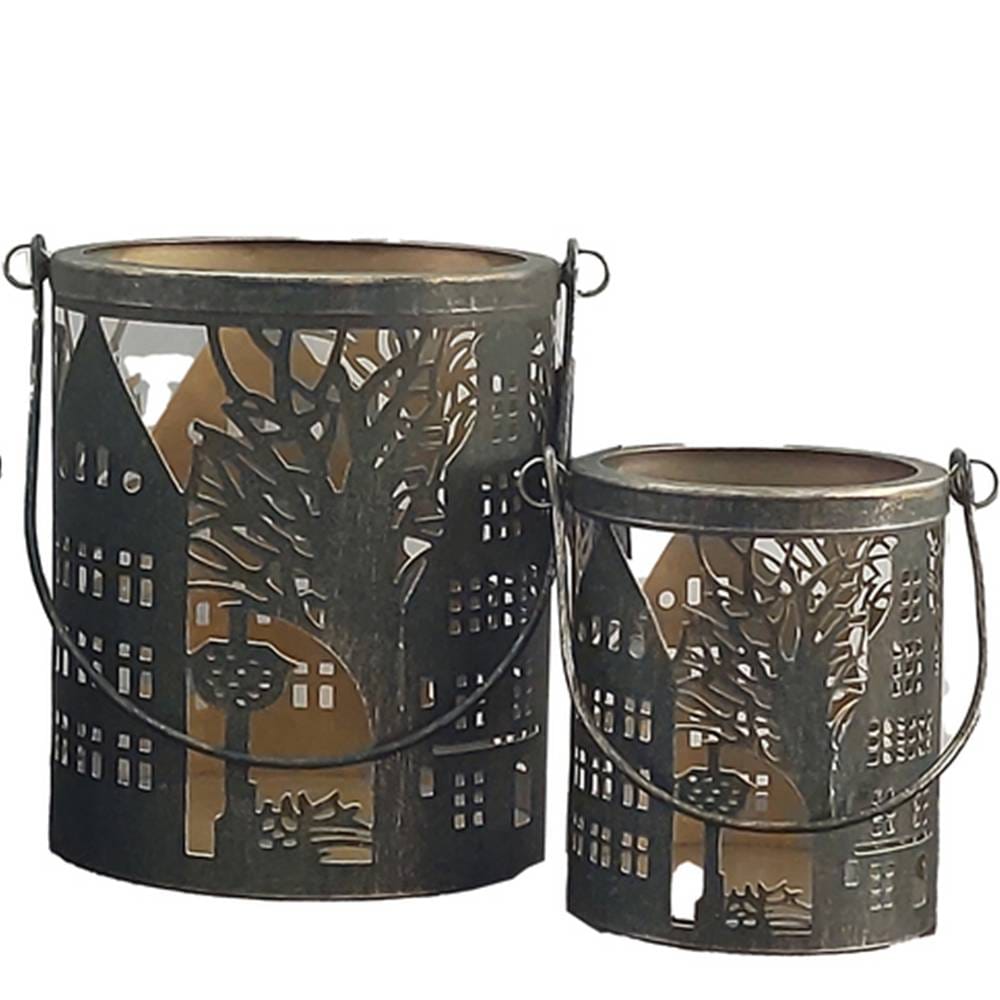 Set 2 porta candele in metallo brunito con traforo case e alberi. Dotati di manico per appenderli. Collezione Borgo Antico.
