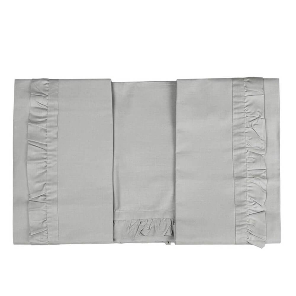 Set lenzuola in puro cotone grigio perla con elegante gala sui bordi. Finitura liscia e luminosa per uno stile raffinato.