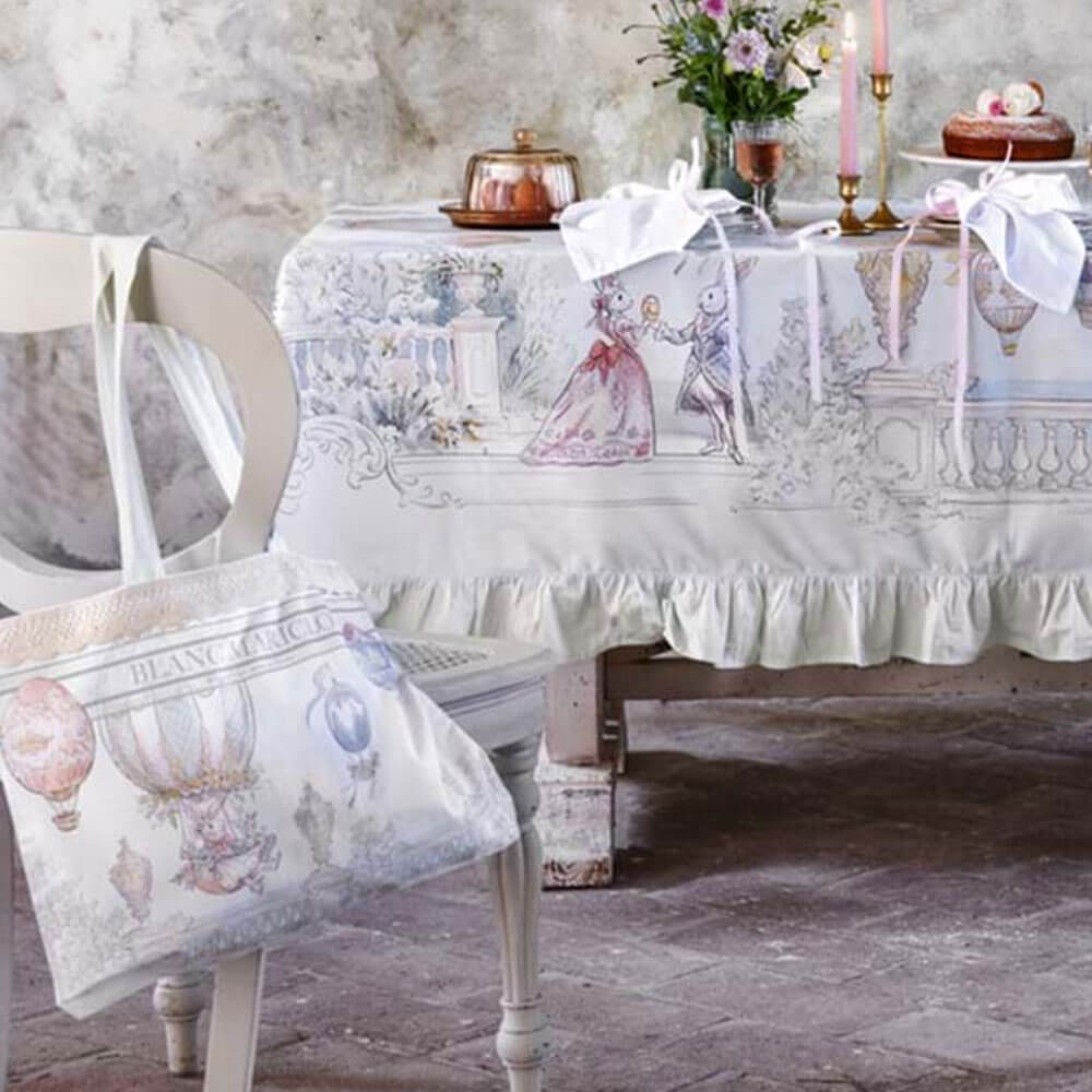 Shopper in tessuto firmata Blanc Mariclò, parte della raffinata Rococo Collection, decorata con un’incantevole stampa: coniglietti in volo su mongolfiere, vasi decorativi e paesaggio in stile barocco. Realizzata in 100% cotone, presenta manici lunghi per un comodo trasporto a spalla e un delicato bordino in pizzo traforato nella parte superiore.