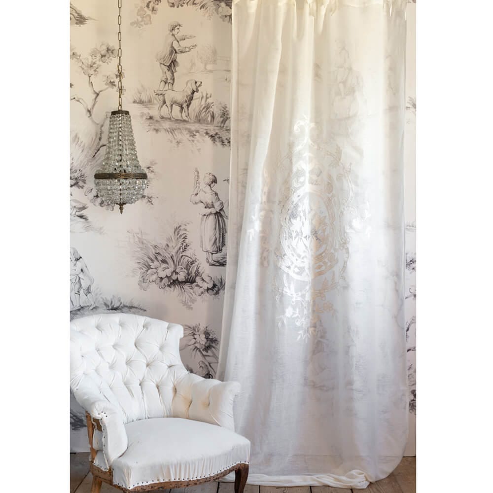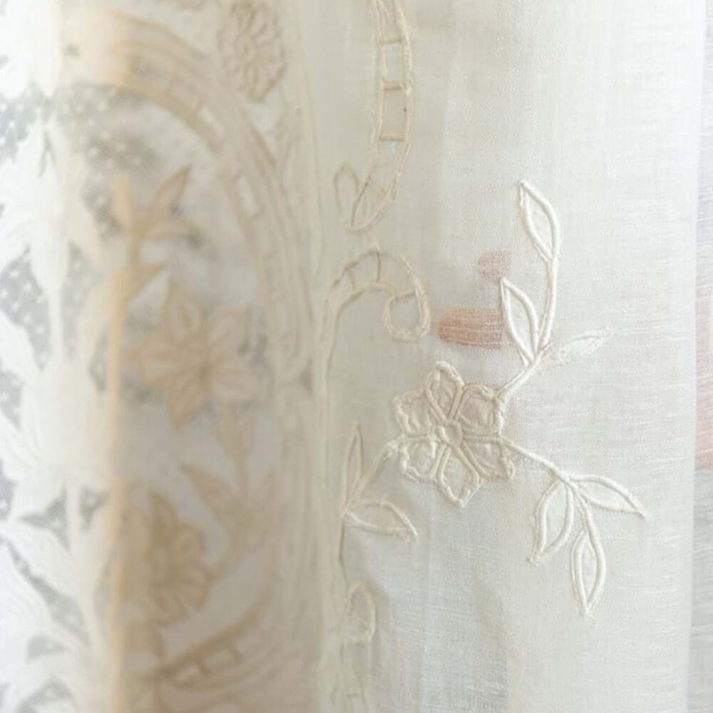 La tenda Blanc Mariclò della collezione Dentelle esprime tutto il fascino dello stile shabby chic. Realizzata in un pregiato mix 50% lino e 50% cotone, presenta una texture leggera e naturale che lascia filtrare la luce con eleganza. Il medaglione centrale ricamato in tonalità beige aggiunge un tocco decorativo raffinato, perfetto per valorizzare salotti, camere da letto o ingressi. La lavorazione ricca di dettagli floreali e arabeschi la rende ideale per ambienti classici o romantici.