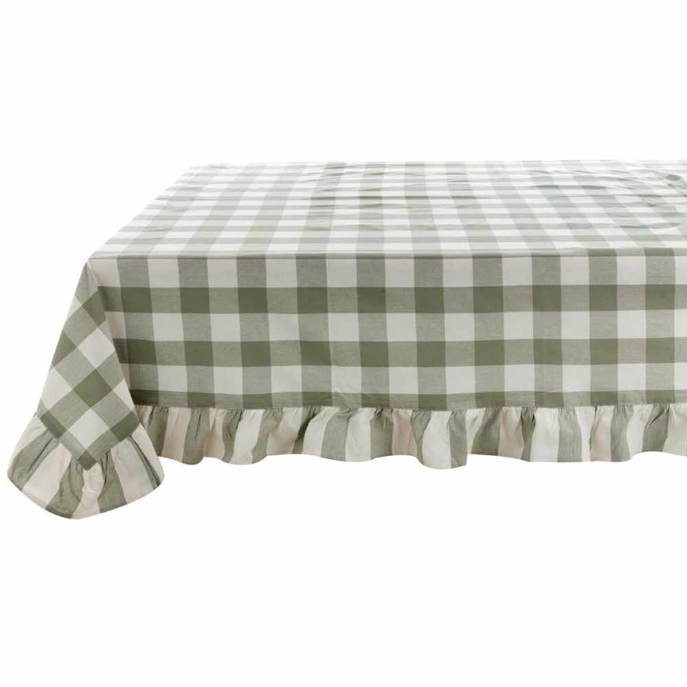 Vichy verde e bianco con gala arricciata da 10 cm: la tovaglia Bolgheri veste la tavola con stile shabby chic.