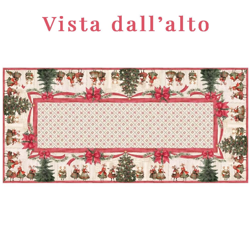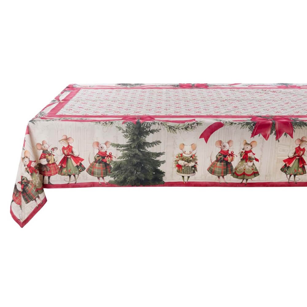 La versione maxi della tovaglia Favola di Natale di Blanc Mariclò è pensata per tavole importanti, conviviali, dove ogni dettaglio conta. Realizzata in puro cotone, unisce praticità e incanto grazie al disegno esclusivo: topolini vestiti a festa danzano attorno a grandi abeti natalizi, incorniciati da fiocchi e ghirlande rosse. Il centro è arricchito da un motivo geometrico con fiocchi e bacche, che richiama le trame delle carte regalo d’epoca.