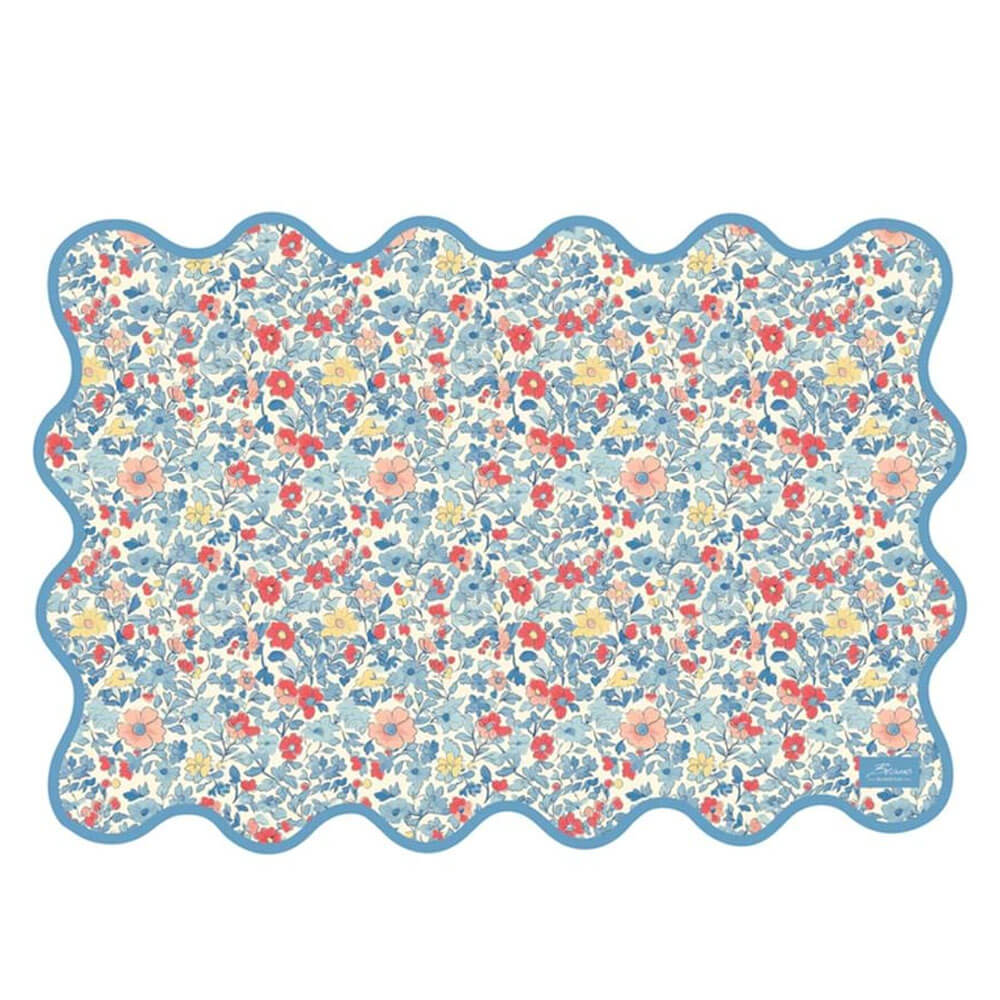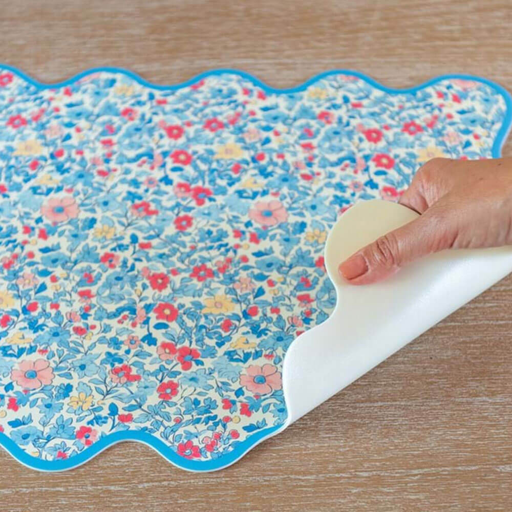 Tovaglietta in vinile con fantasia floreale multicolor e bordo ondulato azzurro. Pratica, elegante e facile da pulire.