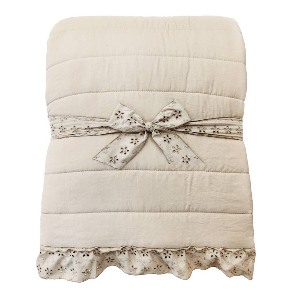 Trapunta beige 1 piazza e mezza in poliestere con cuciture orizzontali e gala Sangallo ricamata. Include 2 copriguanciali coordinati.