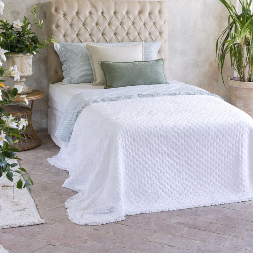 Il bianco puro illumina l’ambiente e valorizza ogni tipo di arredo, dal classico shabby al contemporaneo minimal. La trapuntatura geometrica in rilievo aggiunge volume senza appesantire, mentre il bordo con frange dona un tocco boho-chic raffinato.