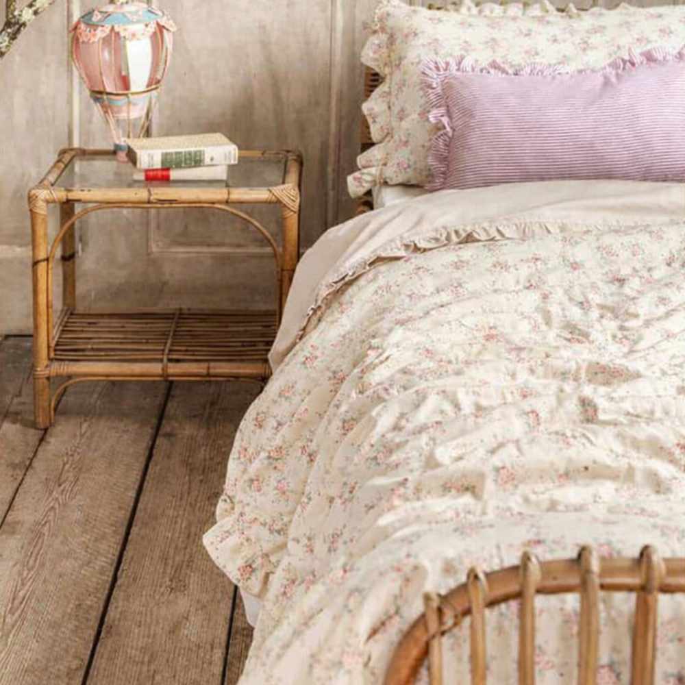 La trapunta singola Blanc Mariclò della collezione Incanto Fiorito è un invito alla dolcezza. Realizzata in morbida microfibra, presenta una raffinata stampa floreale sui toni del rosa e del verde salvia su fondo crema. Il bordo con gala arricciata aggiunge un dettaglio femminile perfetto per camere romantiche, shabby o provenzali.
