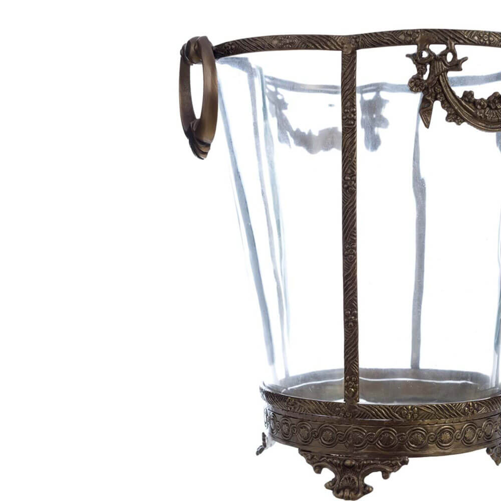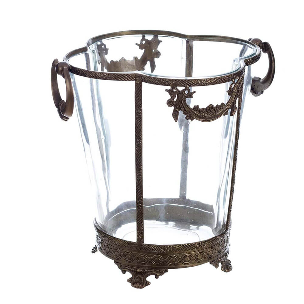 Vaso in vetro con dettagli in ottone brunito e fregi floreali. Stile classico e raffinato per ambienti eleganti.