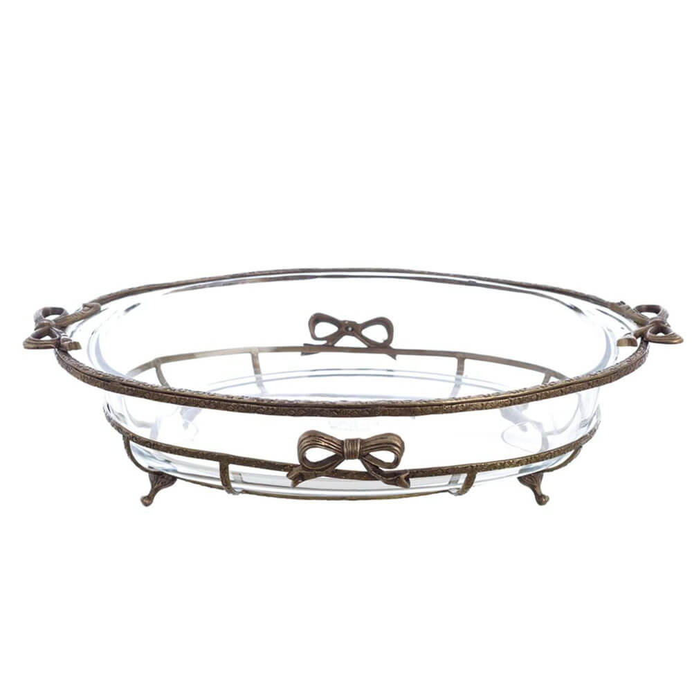 Elegante vassoio ovale in vetro trasparente con struttura in ottone e fiocchi decorativi. Raffinato e scenografico.