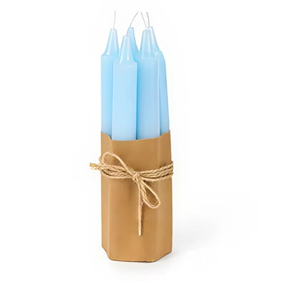 Set 5 candele azzurre alte 18 cm e larghe 2 cm. Perfette durante la primavera o l’estate, sono realizzate da Nuvole di Stoffa.