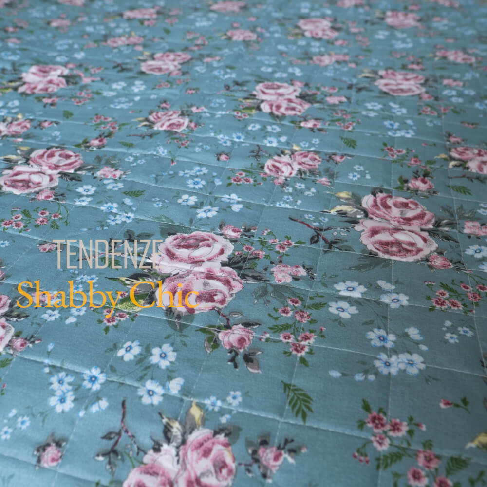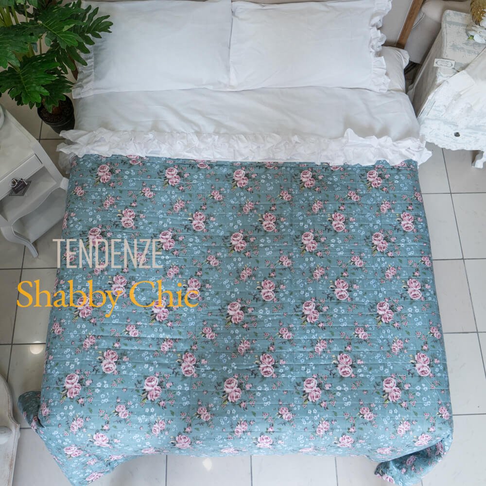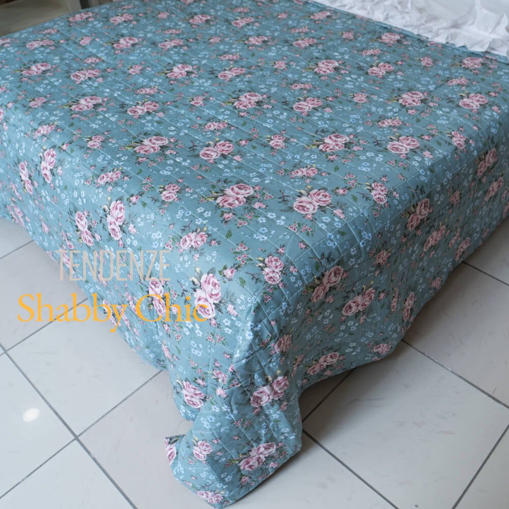 Boutis trapuntato matrimoniale verde petrolio con fiorellini rosa e azzurri.