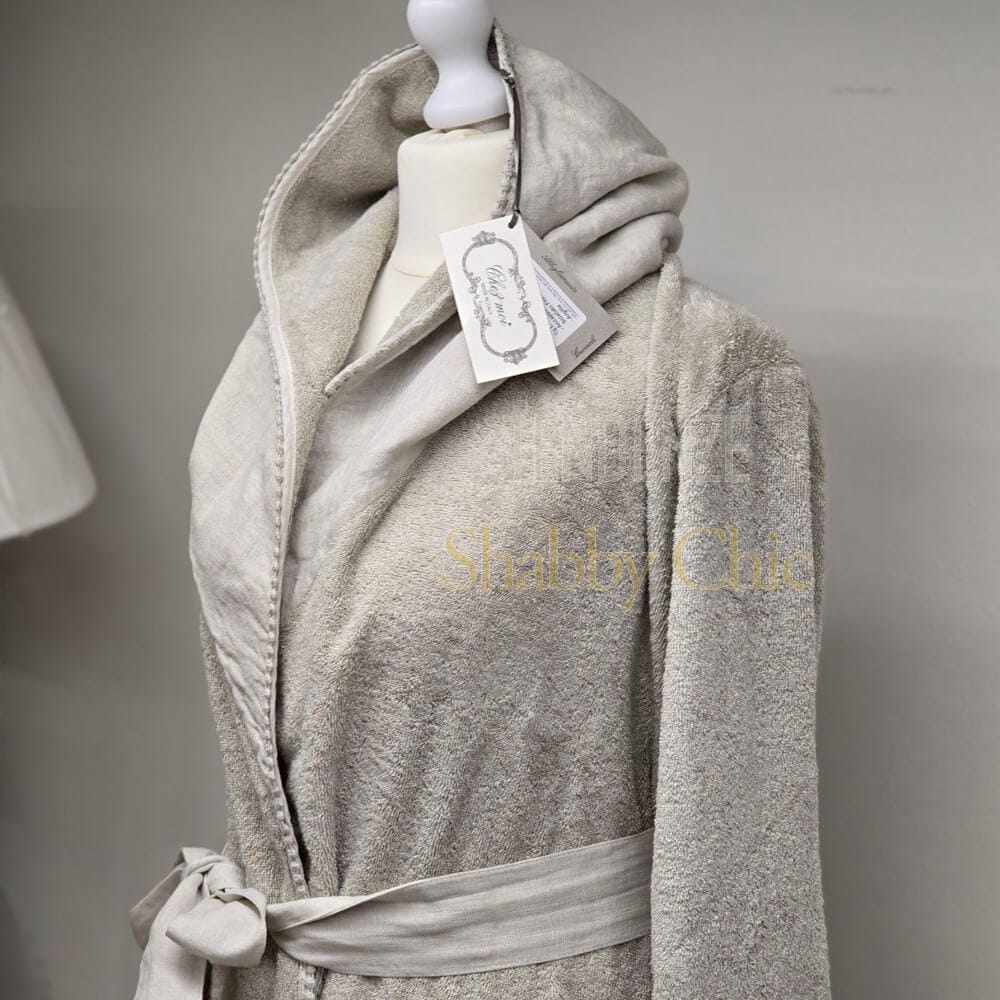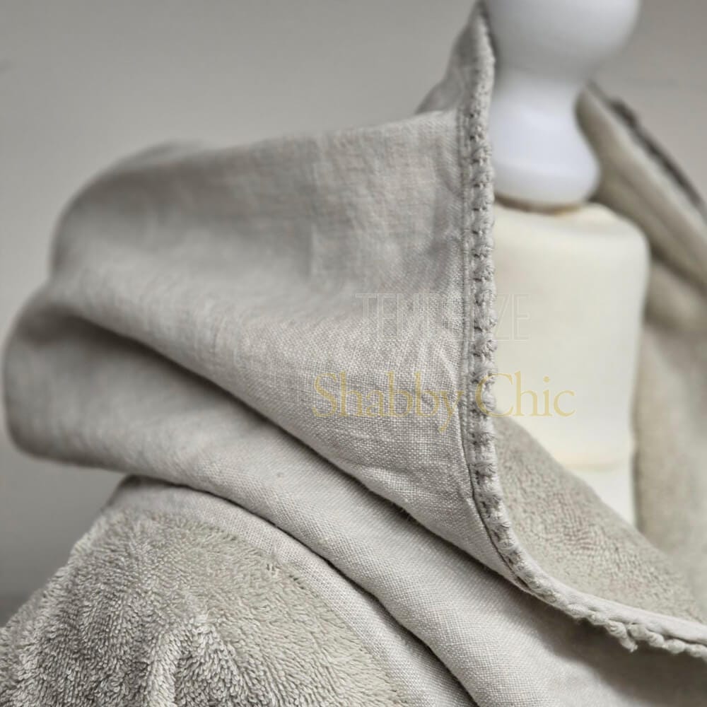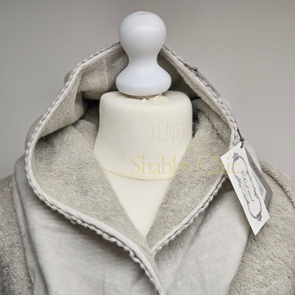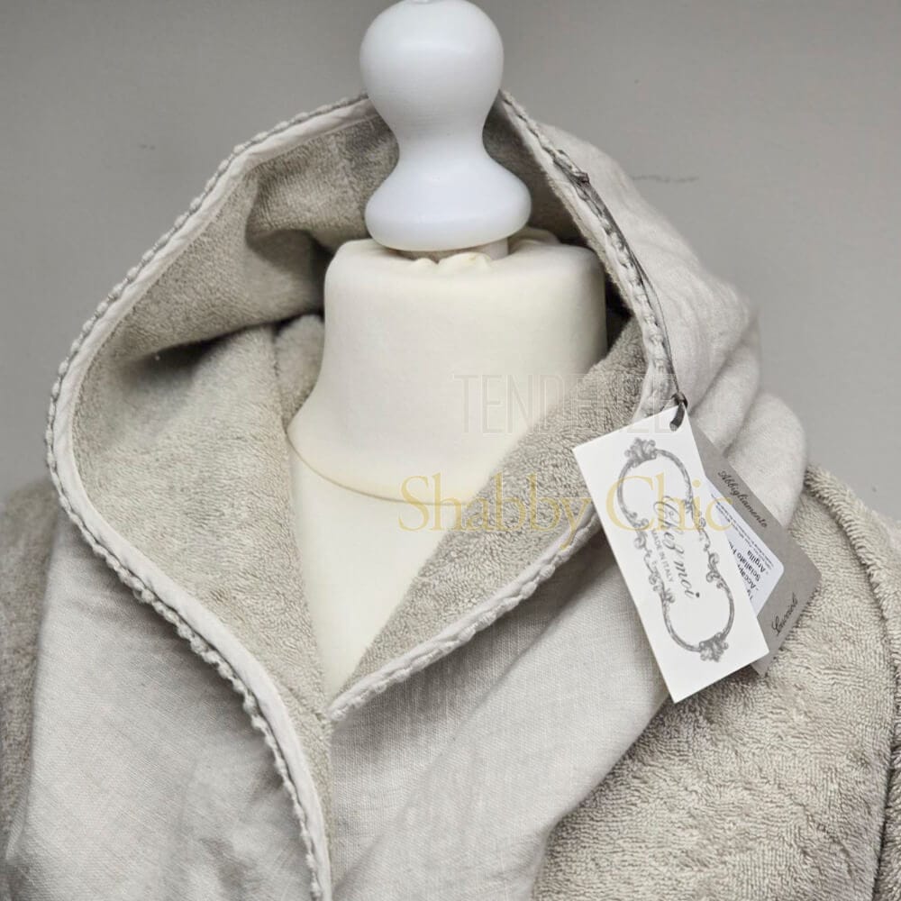 Il collo sciallato, esterno in lino e interno in morbida spugna di cotone, offre un comfort avvolgente.