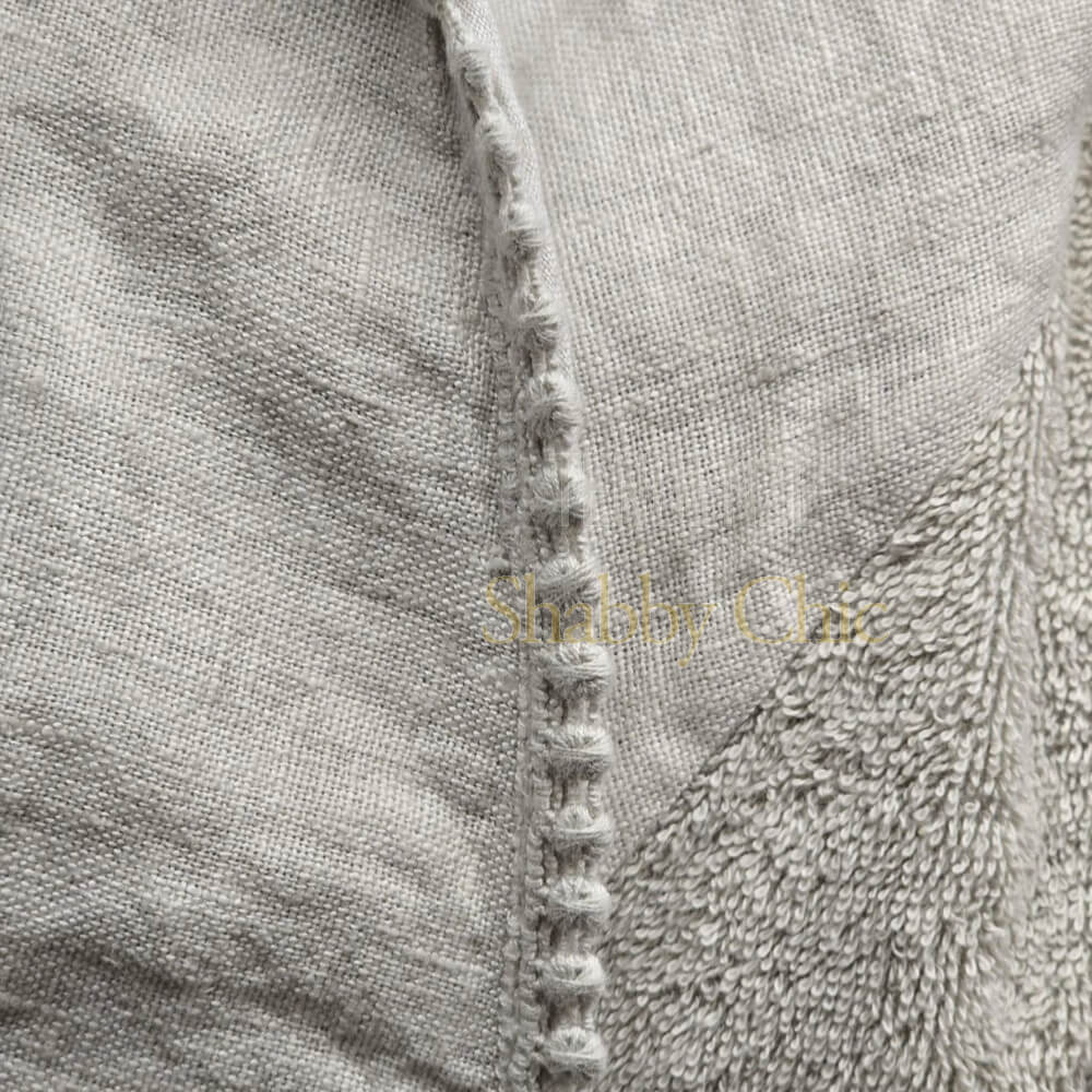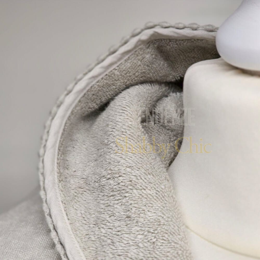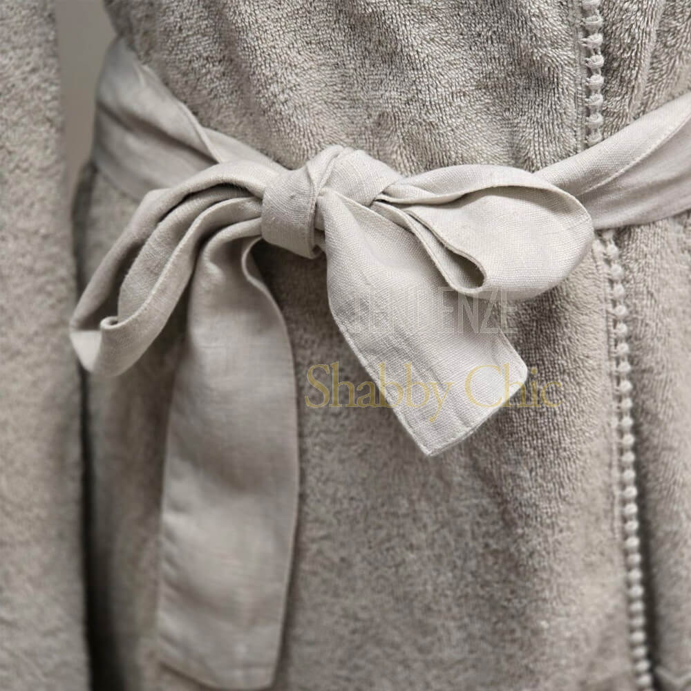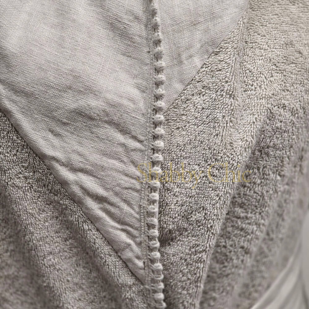 Il collo sciallato, esterno in lino e interno in morbida spugna di cotone, offre un comfort avvolgente.