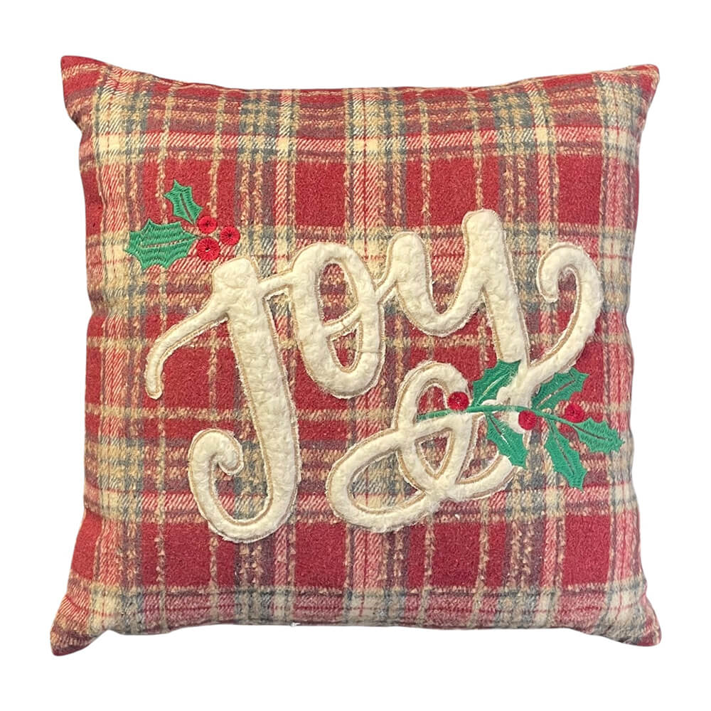 Le coussin de Noël Clodette est l’expression parfaite d’un style classique avec une touche Shabby Chic. Réalisé en tissu écossais épais et doux, il est décoré du mot “Joy” en broderie bouclée blanche, nettement tridimensionnelle, et agrémenté d’appliqués en feutre vert et rouge représentant des feuilles de houx avec des baies.