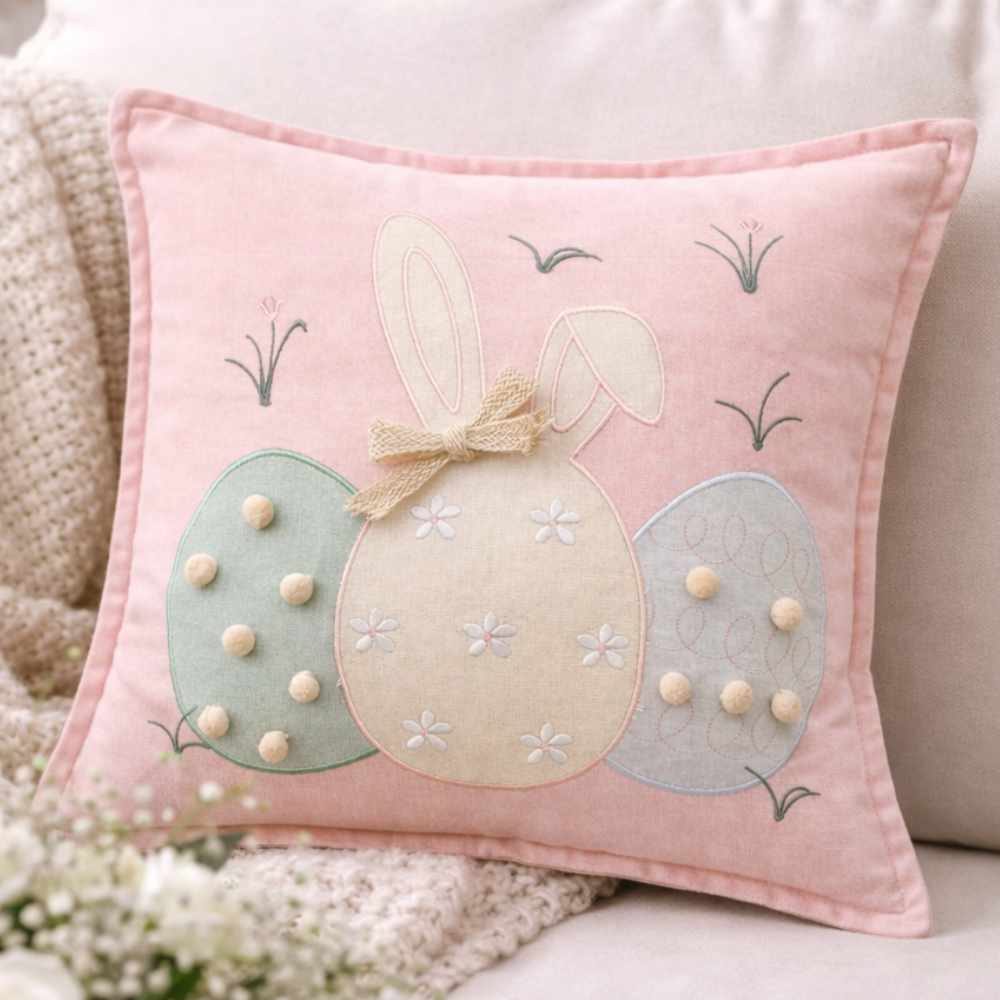 L’uovo centrale richiama la sagoma di un coniglietto stilizzato con orecchie applicate e un fiocco beige annodato che aggiunge movimento e un tocco romantico. Intorno, sottili ricami che richiamano fili d’erba completano la scena con discrezione, rendendo l’insieme armonioso e curato nei dettagli.