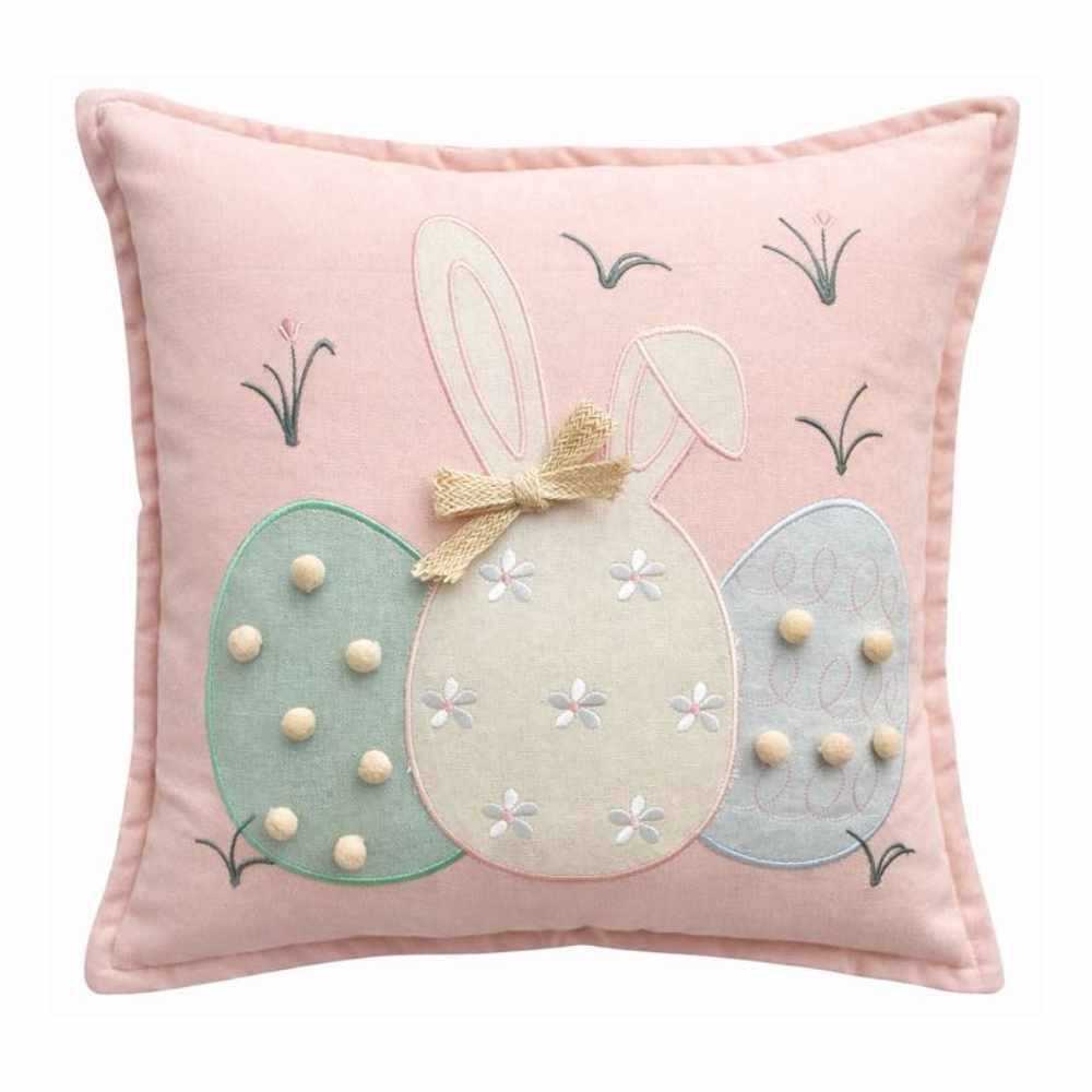 La base in cotone rosa cipria dona calore e femminilità, valorizzando la composizione centrale formata da tre uova decorative nei toni verde salvia, panna e azzurro polvere. Ogni uovo è impreziosito da ricami delicati e piccoli pom pon applicati in rilievo che creano un elegante effetto tridimensionale.